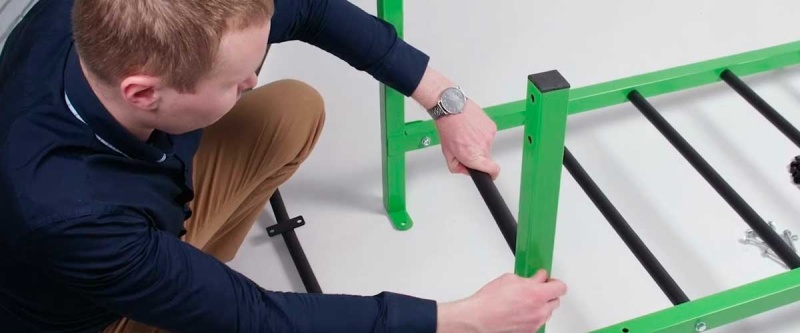Меньше сложностей с тем, как собрать шведскую стенку в распор: есть модели, не требующие сверления. Для фиксации используется выдвижная конструкция.- Работа начинается со сборки тренажера.