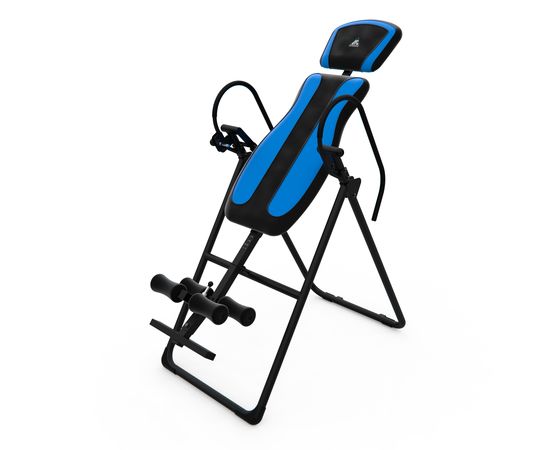 Инверсионный стол IT9750 для домашнего использования. Корпус черного цвета, спинка темно-синяя с яркими синими вставками. Максимальный вес пользователя 120 кг.