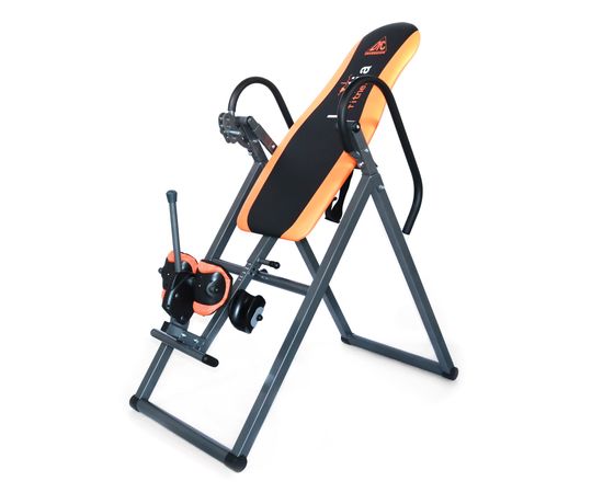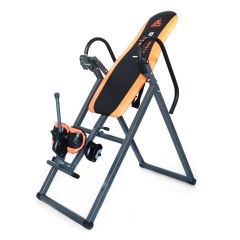 Инверсионный стол для домашнего использования IT005, модель Landia. Цвет спинки чёрный с оранжевыми вставками, цвет валиков оранжевый. Рост пользователя от 150 до 198 см. Максимальный вес пользователя 130 кг.
