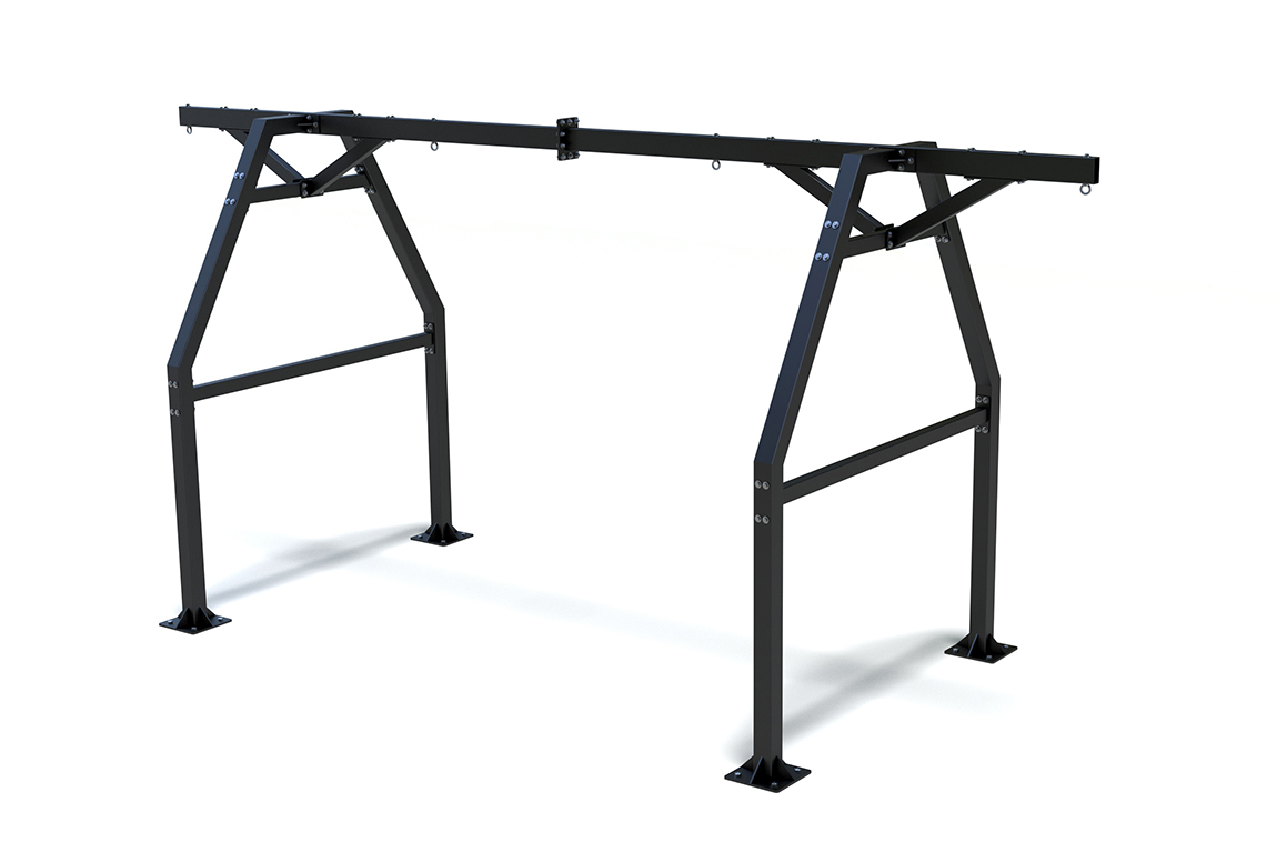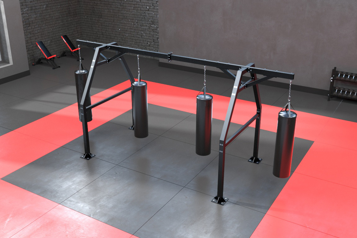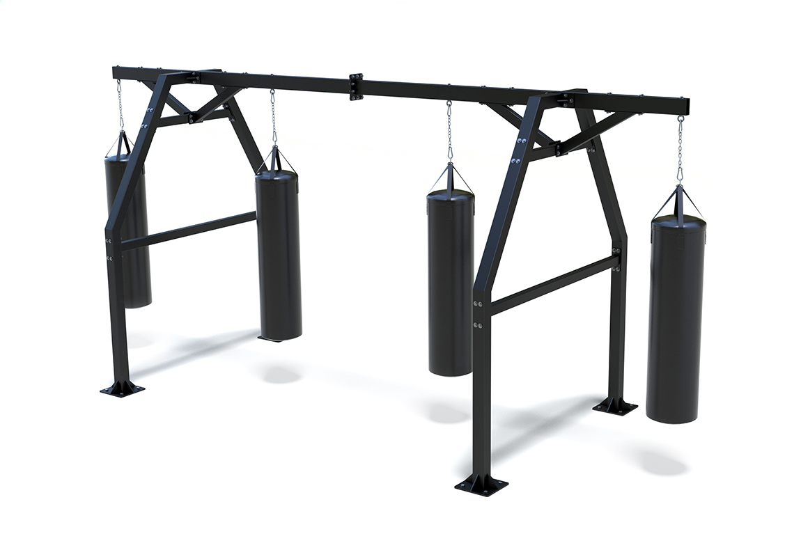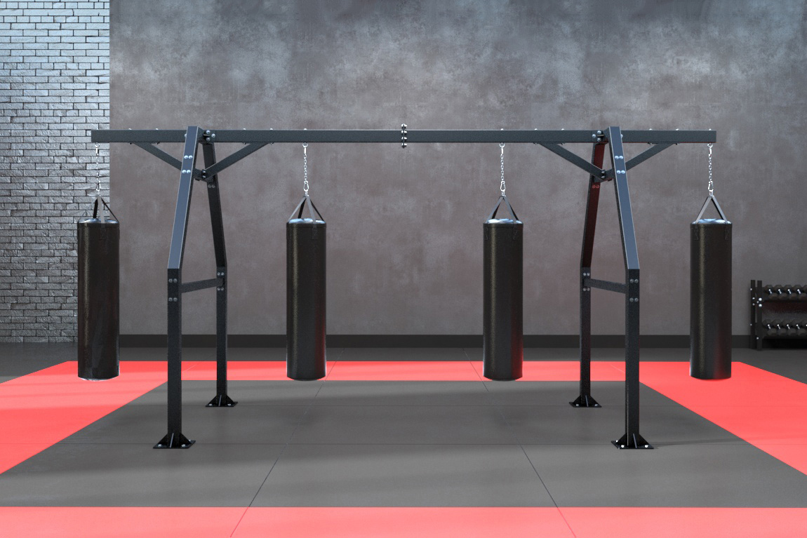 - Стойка оборудована кронштейнами, к которым с помощью карабинов крепятся 4 боксерских мешка.