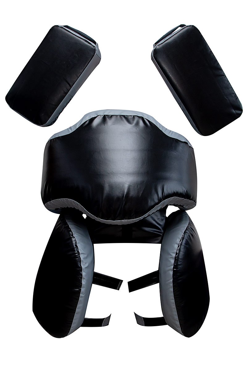 - Комплект состоит из защитного жилета (пояса тренера) для отработки ударов по корпусу, защиты бедра для отработки лоу-кик и падов для тренировки ударов руками и ногами на всех уровнях.