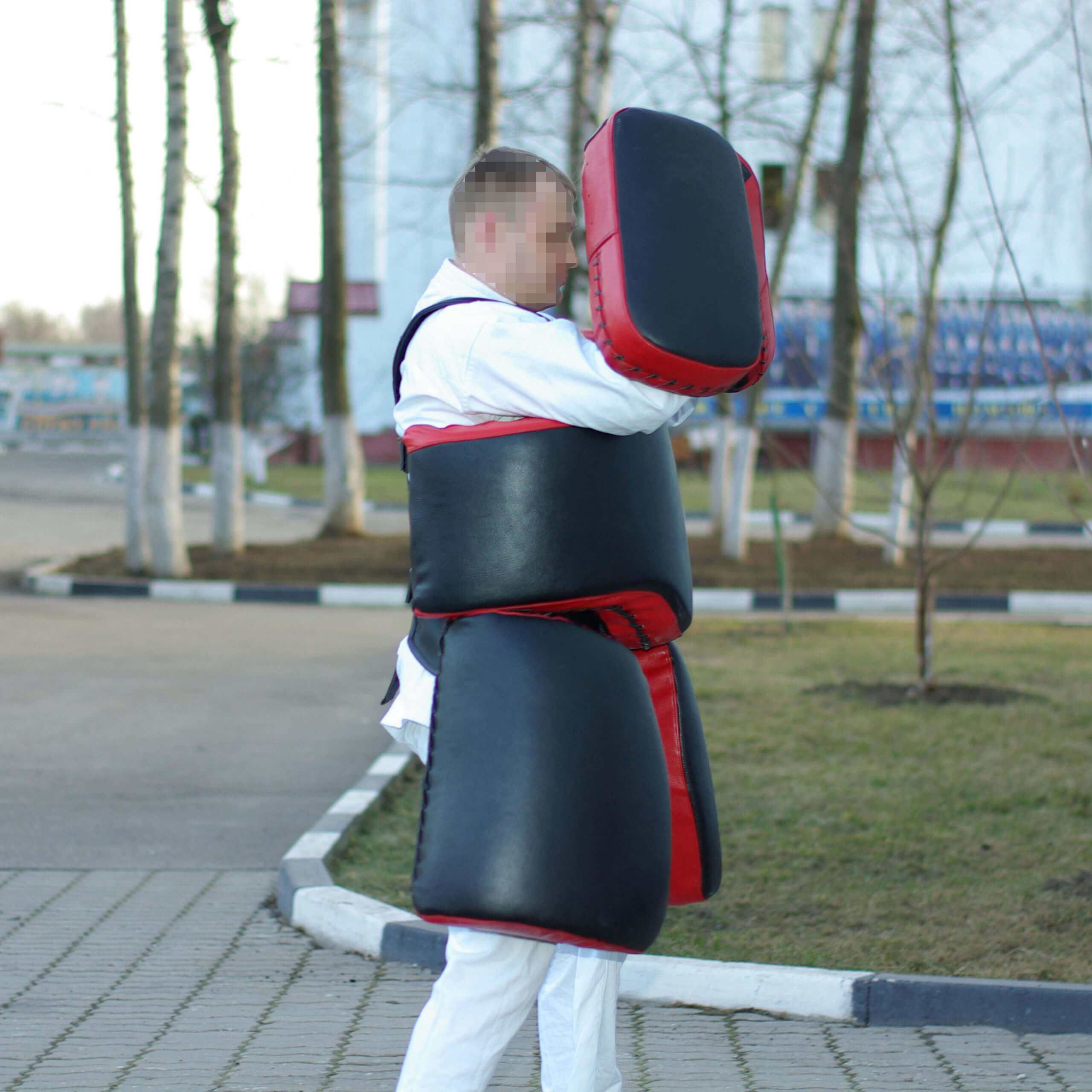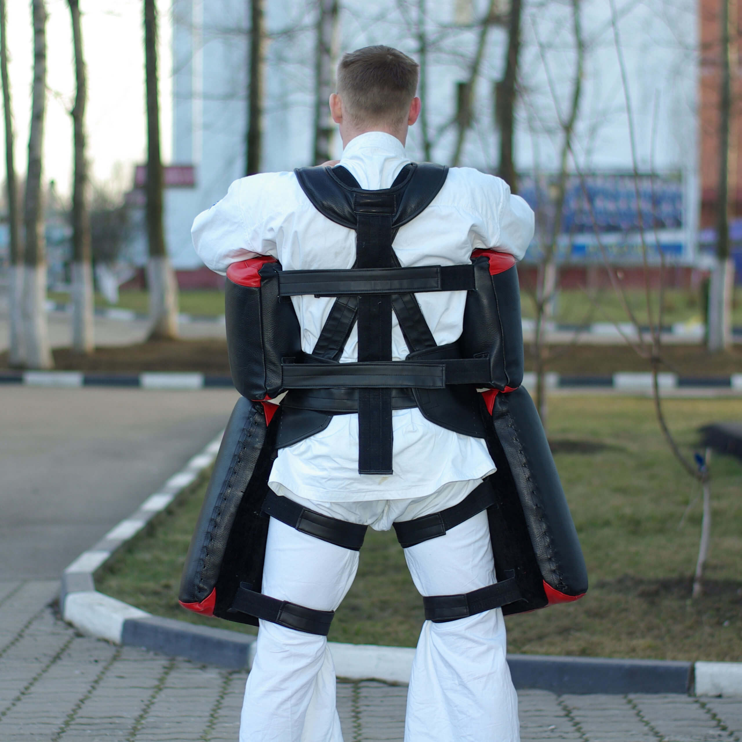 - Жилет для отработки ударов. Его использование позволяет отрабатывать любые удары руками и ногами по корпусу. Удобное крепление на застежках-липучках позволяет быстро одевать как жилет, так и комплект «Рыцарь» в целом, одновременно делая его универсальным по росту и комплекции.