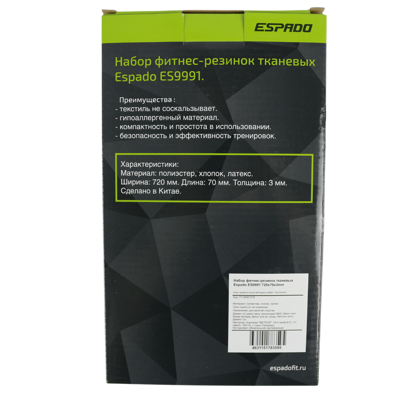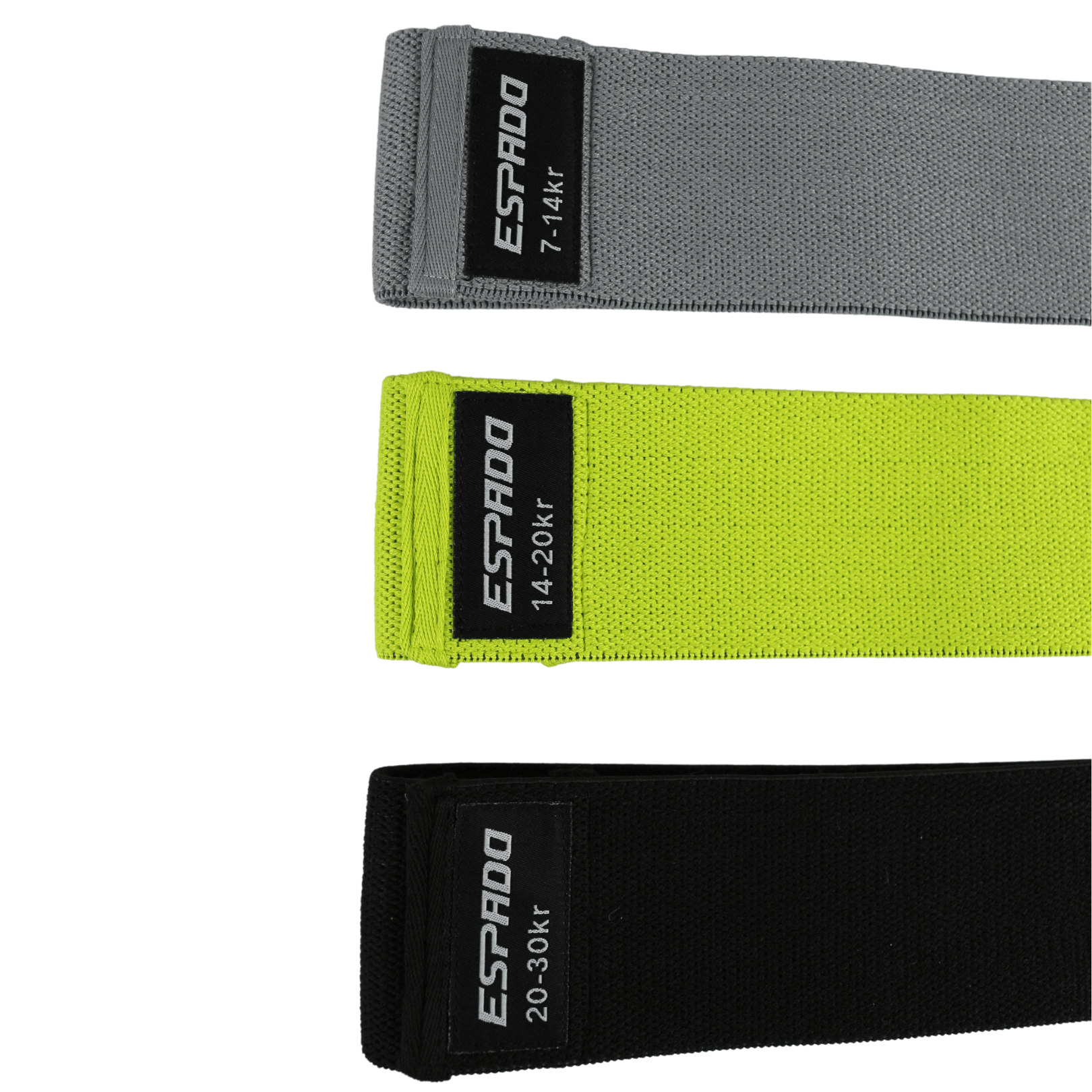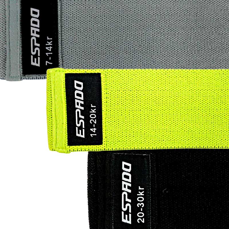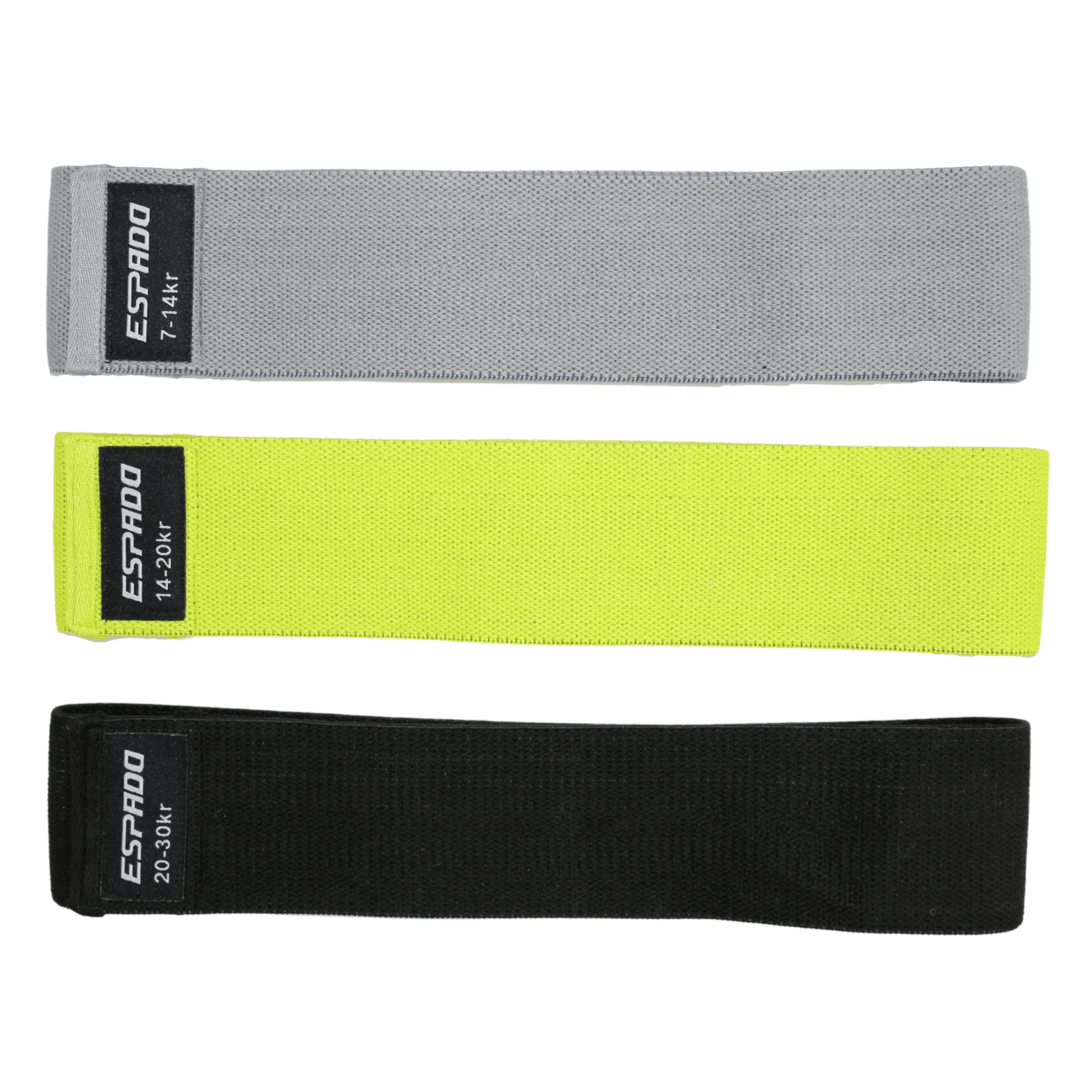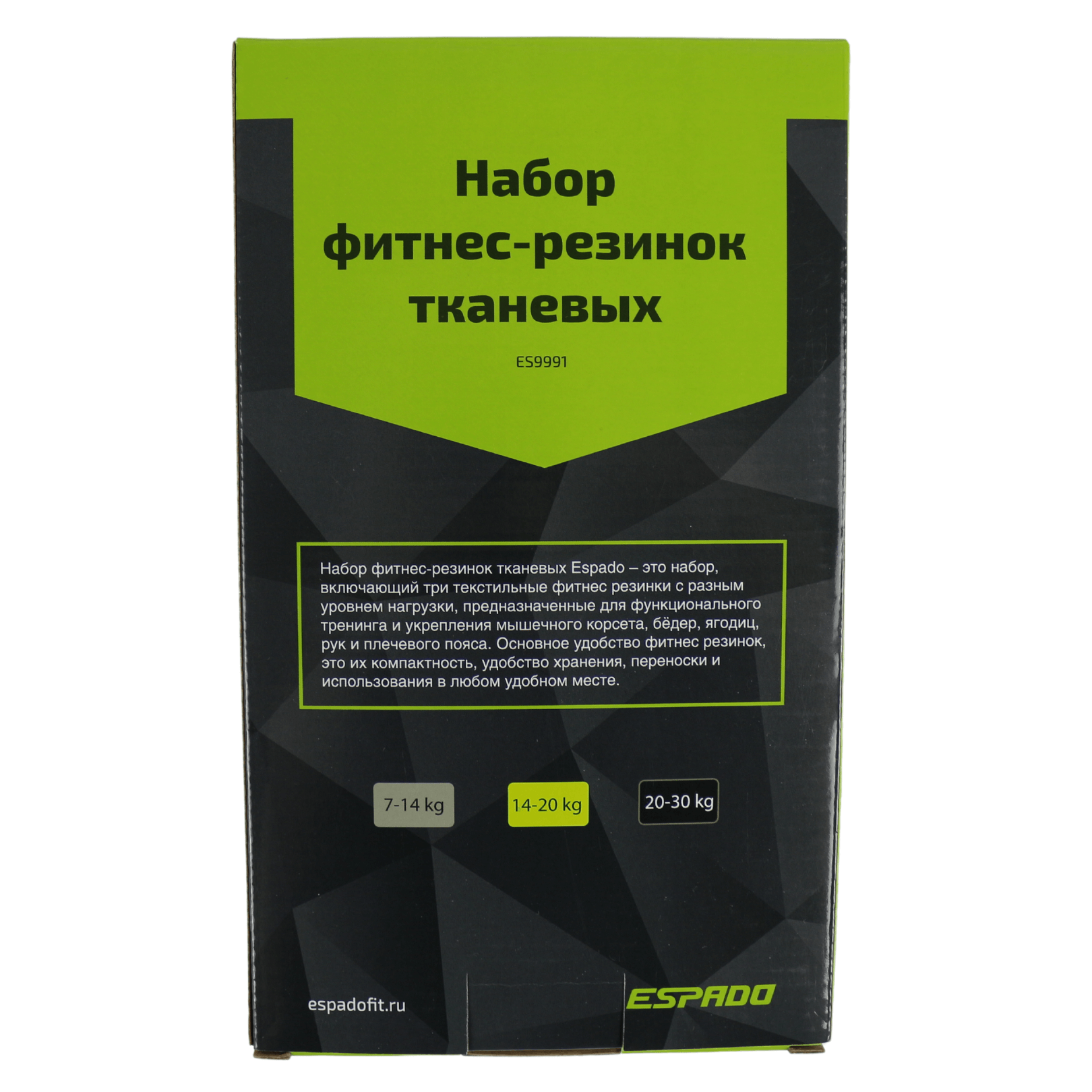 Набор фитнес-резинок тканевых Espado – это набор, включающий три текстильные фитнес резинки с разным уровнем нагрузки, предназначенные для функционального тренинга и укрепления мышечного корсета, бёдер, ягодиц, рук и плечевого пояса. Основное удобство фитнес резинок, это их компактность, удобство хранения, переноски и использования в любом удобном месте.