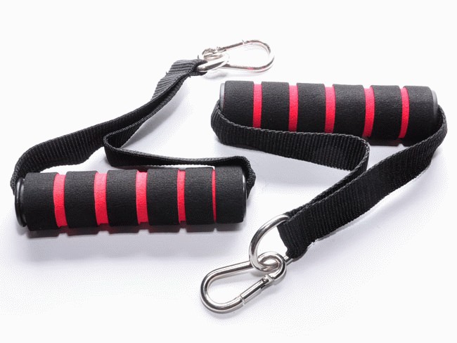 - У ручек металлическая основа с крепким карабином. К ним можно присоединить любые разновидности эспандеров: трубок, ленточных, петлевых, жгутов.