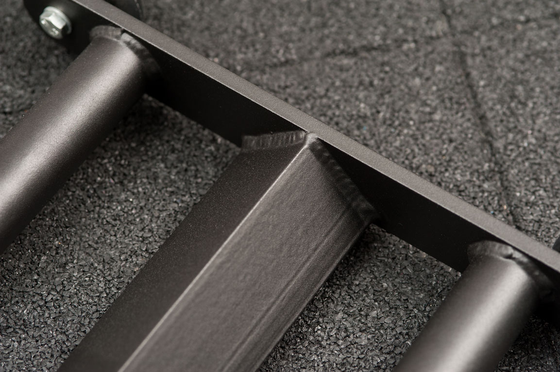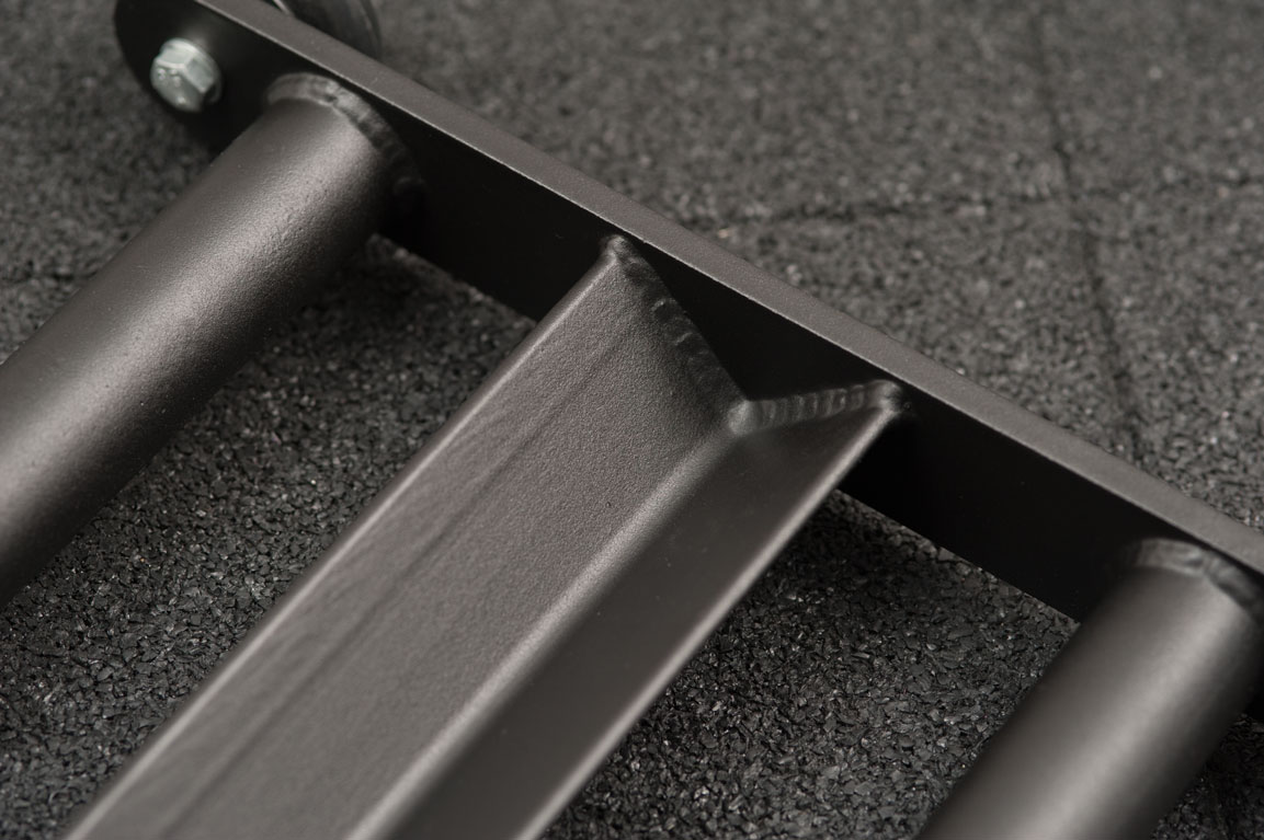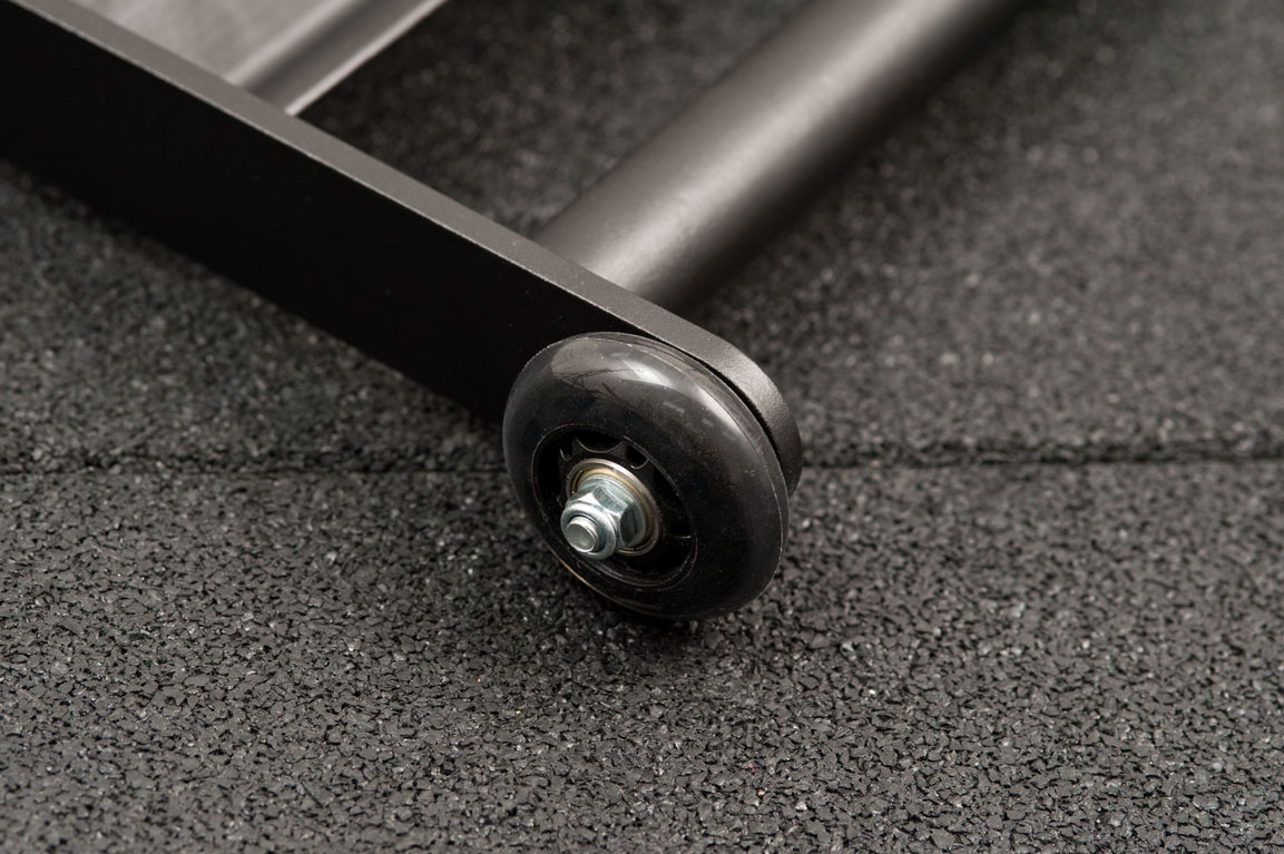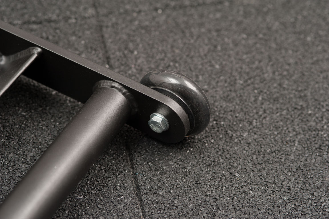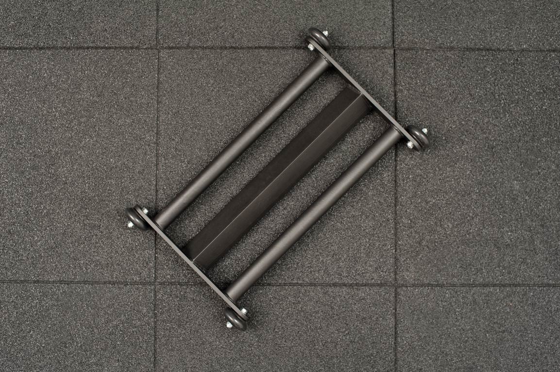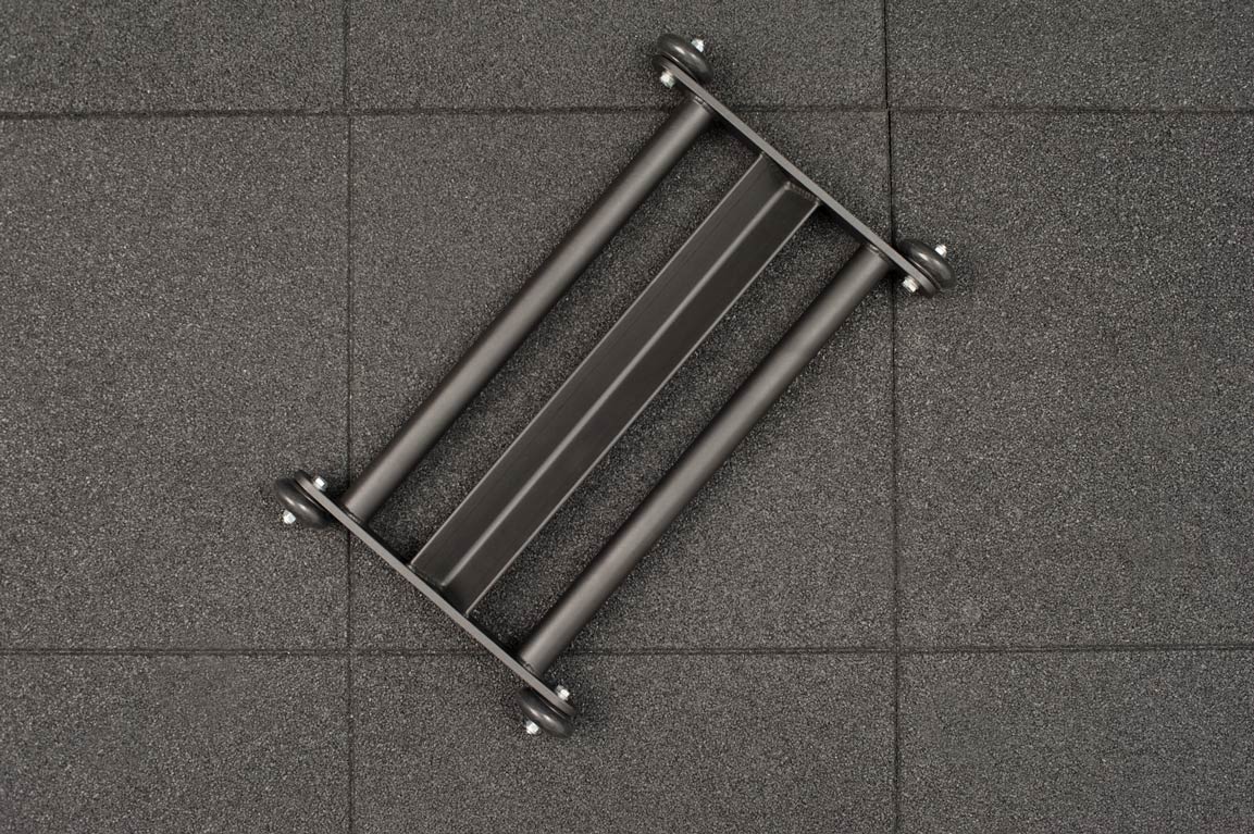 Роллер имеет полиуретановые колеса с подшипниками для легкого вращения, специальный упор для ног в виде удобного металлического уголка, а так же 2 параллельные рукоятки. Каркас роллера изготавливается из толстостенного металла и окрашивается черной порошковой краской.