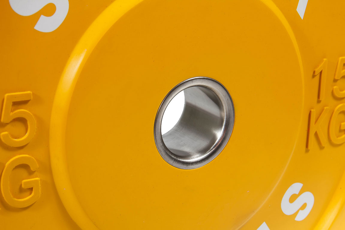 - Втулка для грифа выполнена из нержавеющей стали, благодаря чему диск жестко удерживается на нем