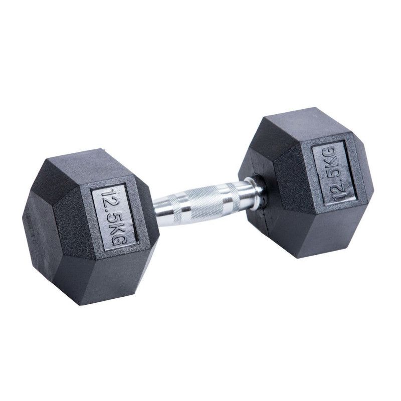 - Гантель имеет обрезиненные шестиугольные грузы. Гексагональная форма грузов и резиновое покрытие предотвращают катание гантелей.