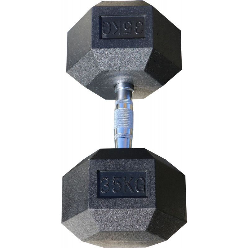 - Гантель имеет обрезиненные шестиугольные грузы. Гексагональная форма грузов и резиновое покрытие предотвращают катание гантелей.