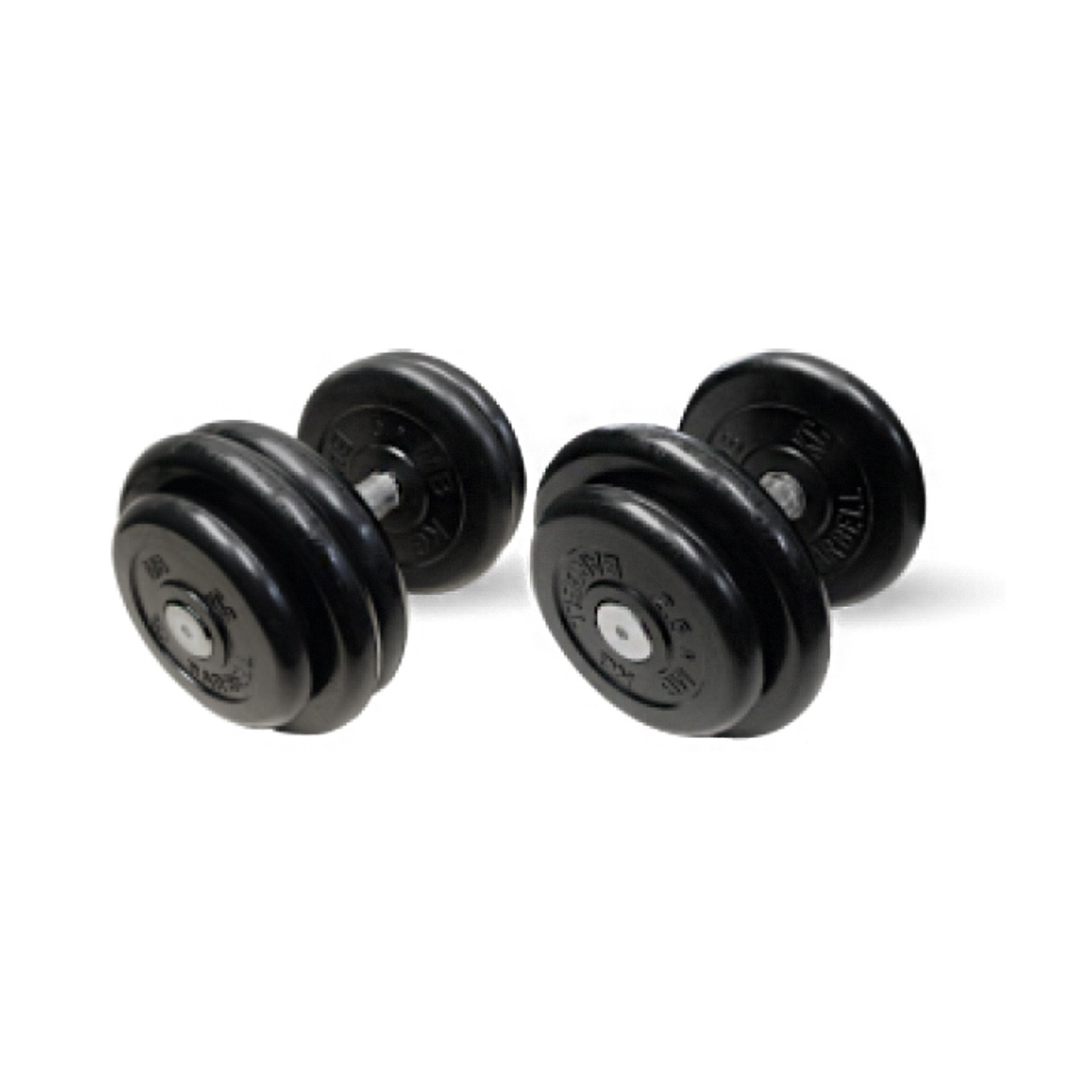 - Гантели собираются из весов в 1,25; 2,5 и 5 кг. и ручек с заглушками.
