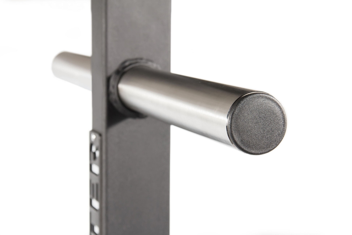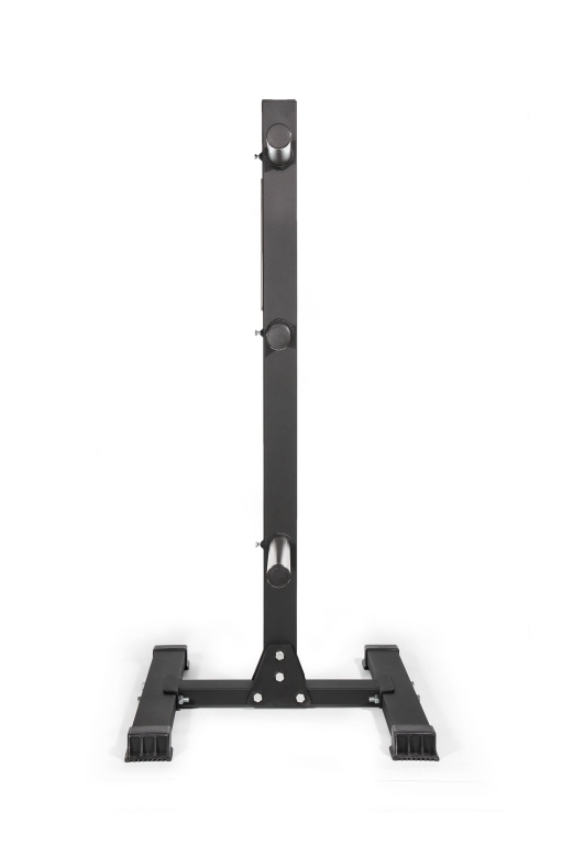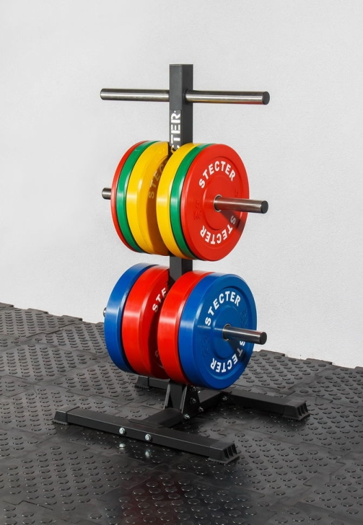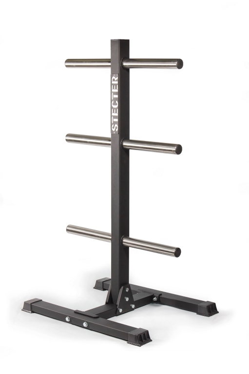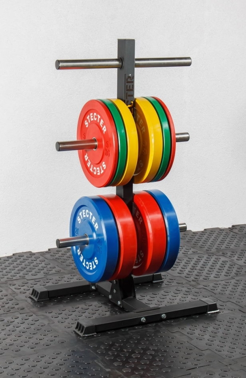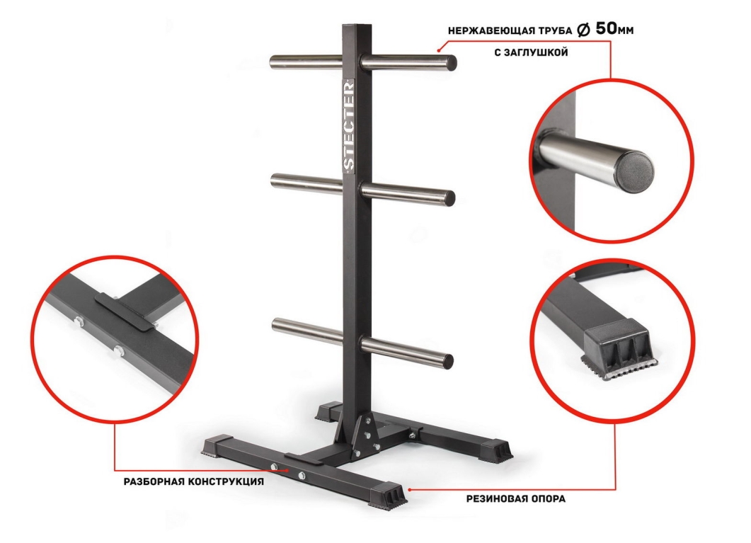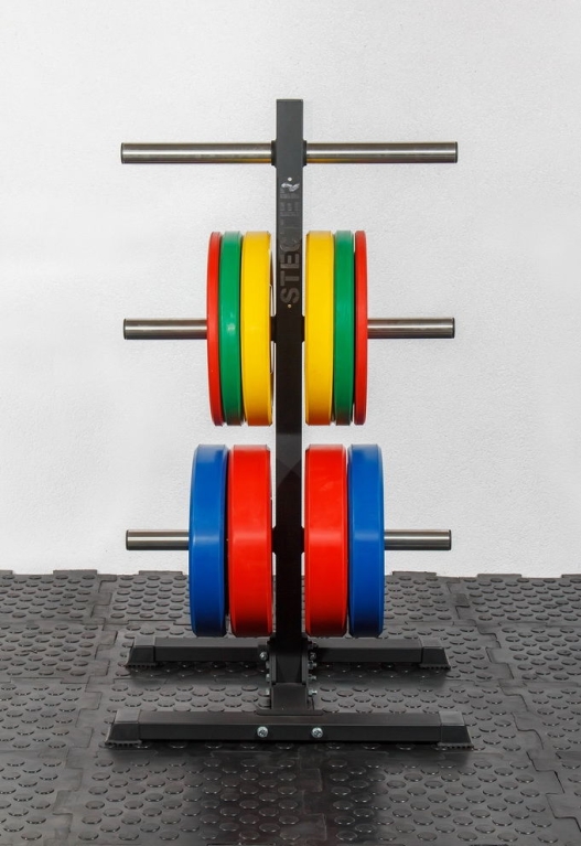 - К основанию крепится вертикальная опора, в которую устанавливаются поперечные трубы из высококачественной нержавеющей стали. Именно на них хранятся диски для штанги олимпийского стандарта.