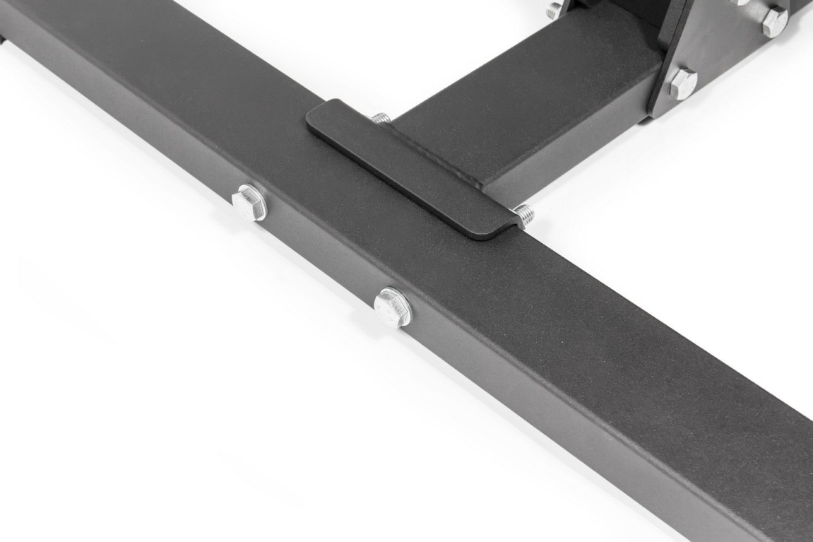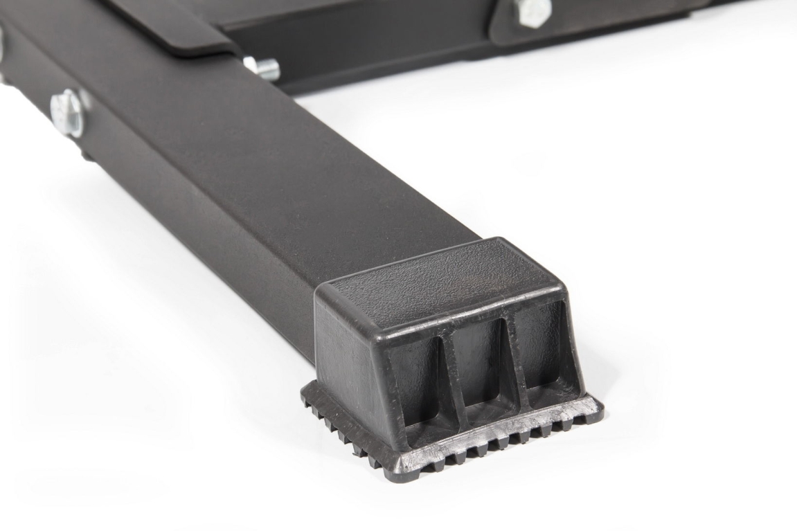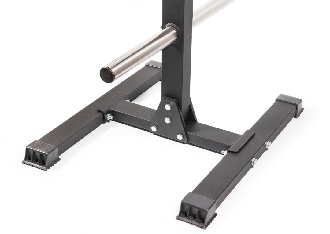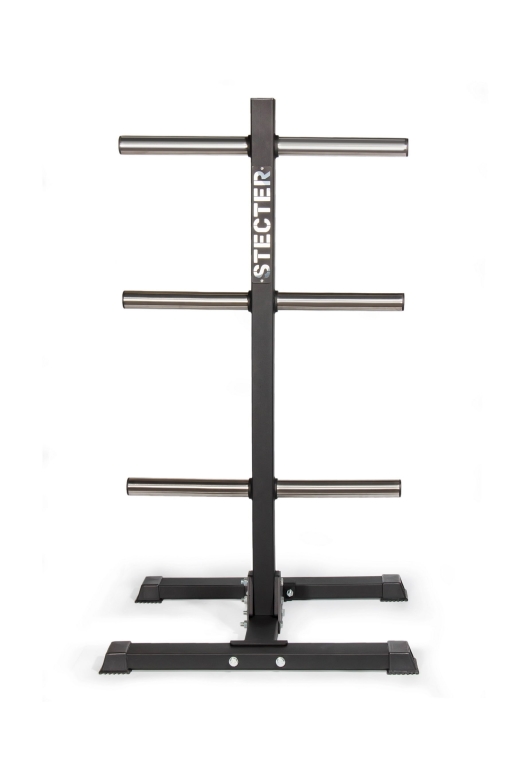 - К основанию крепится вертикальная опора, в которую устанавливаются поперечные трубы из высококачественной нержавеющей стали. Именно на них хранятся диски для штанги олимпийского стандарта.