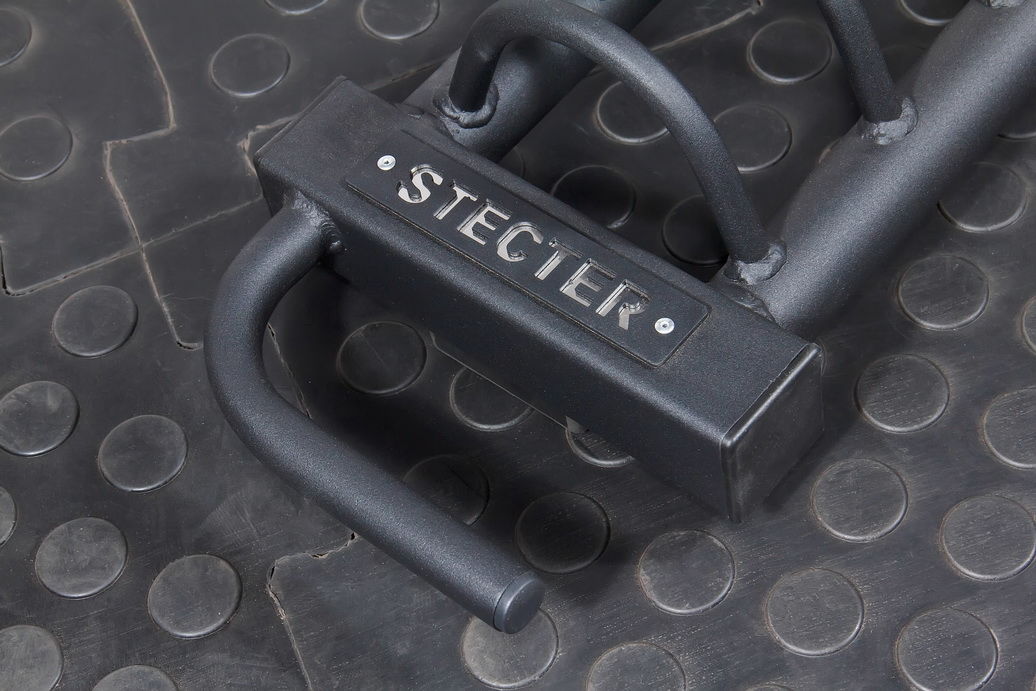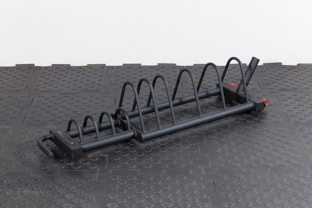 - Подставка имеет 5 отсеков для парного размещения дисков весом от 5 до 25 кг и дополнительные 3 отсека так же для парного размещения малых каучуковых дисков весом от 0.5 до 2.5 кг.