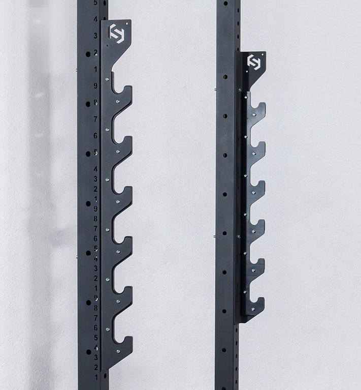 Настенный кронштейн для хранения грифов с пластиковыми накладками великолепно справляется с задачей удобного и бережного хранения Вашего инвентаря. Он может крепиться не только к стене, но и на опорные стойки функциональной рамы.