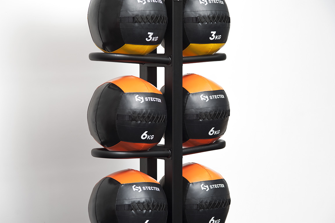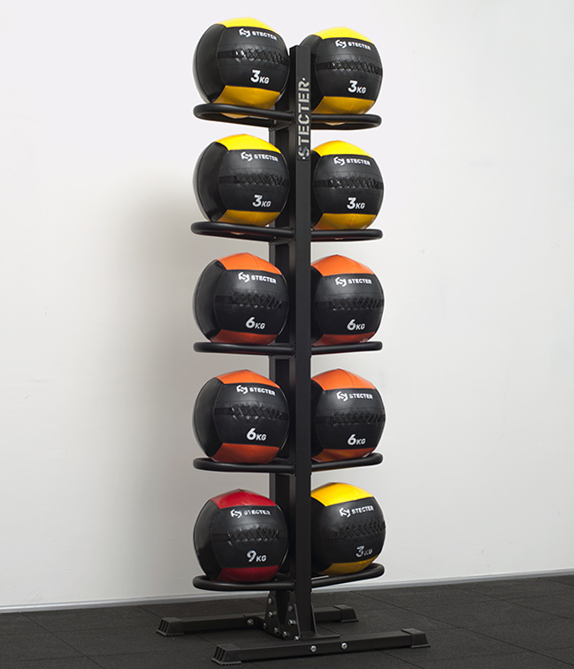 - Удобство в использовании. Все полки имеют травмобезопасную округлую конструкцию. Каждый мяч укладывается на индивидуальную полку, это позволяет хранить более тяжелые мячи ниже, а более легкие - выше. При небольшой площади основания стойки Вы храните целых 10 медицинболов!