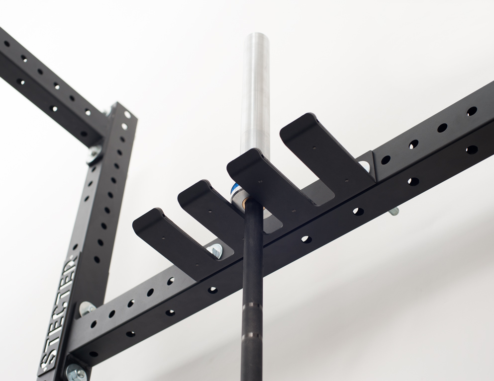 Кронштейн для хранения грифов устанавливается на балку функциональной рамы и способен вместить до 3 олимпийских грифов. В отличие от напольной подставки для грифов или кронштейна, где для хранения грифа требуется вставлять его в какую-то трубу данный вид хранения пне подвергает излишнему износу втулку грифа и бережно храни ваш инвентарь в подвешенном состоянии. Для дополнительной безопасности и фиксации грифов на кронштейне предусмотрены специальные загибы под углом 45 градусов - она не позволят случайно выпасть грифам.