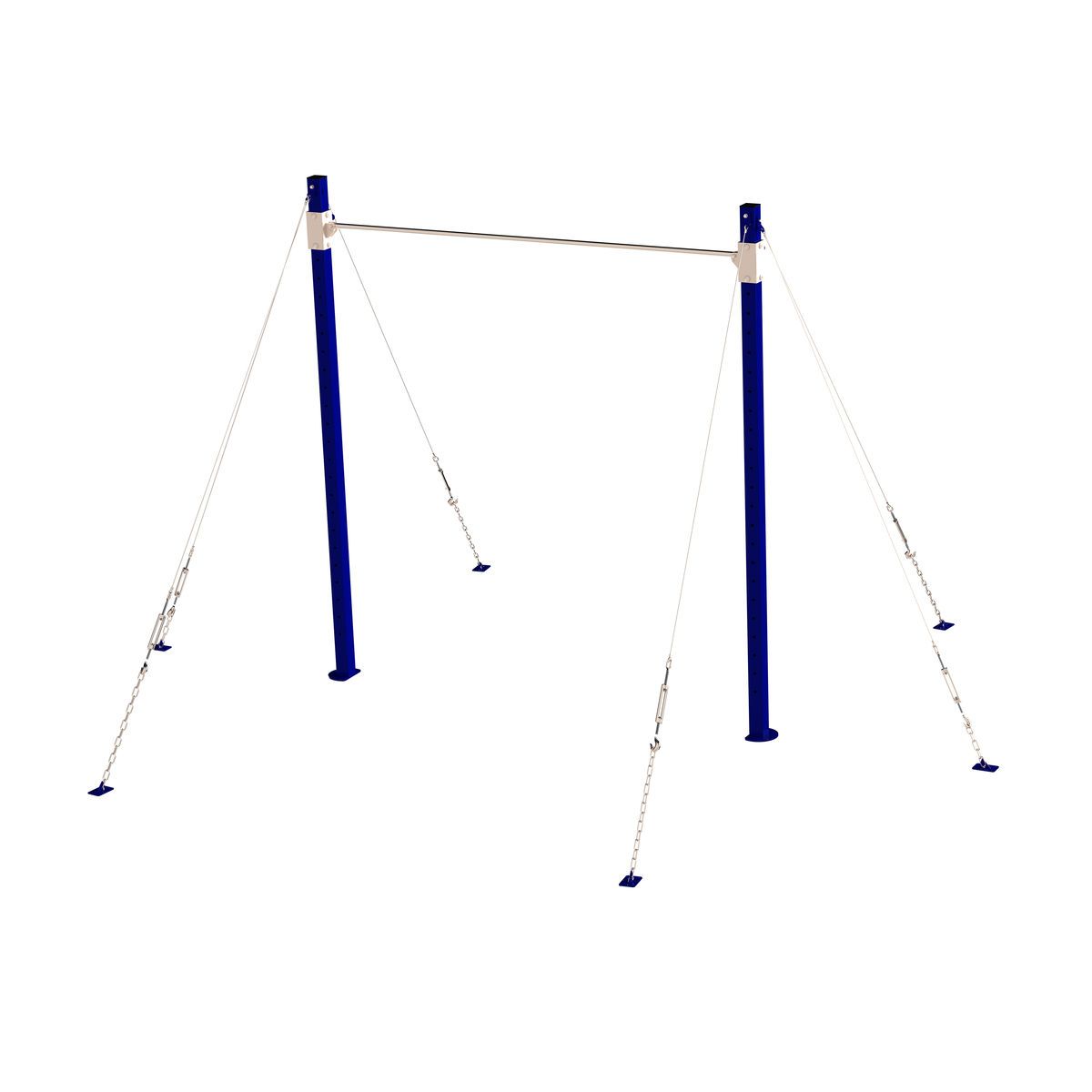 - Стойки установлены на полу, в верхний их конец фиксируются растяжки, которые вторым концом крепятся к узлам крепления к полу. По стойкам перемещаются держатели перекладины, с зафиксированной на них перекладиной.