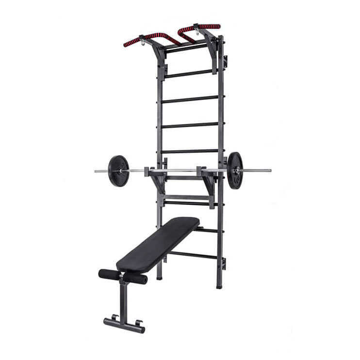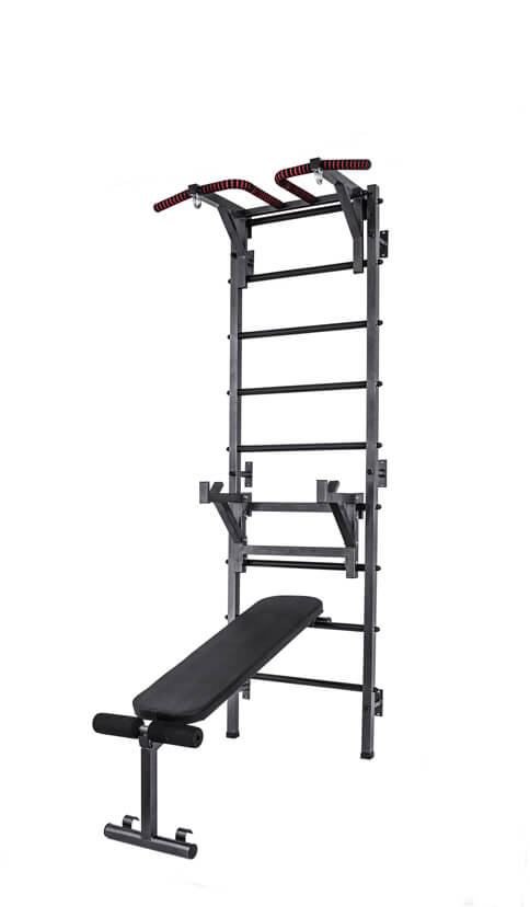 По краям турника расположены металлические кольца для подвешивания боксёрского мешка, колец, каната и прочих спортивных снарядов. Турник и брусья оснащены мягкими неопреновыми ручками. Турник, брусья и скамья легко перевешиваются на перекладины шведской стенки, что позволяет менять их высоту.