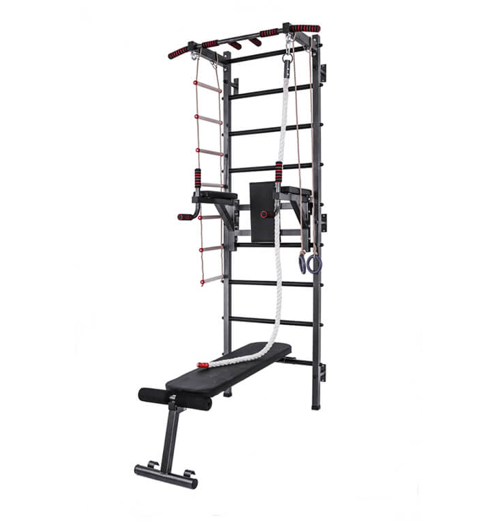 Данный комплекс укомплектован навесным оборудованием: веревочная лестница, канат и кольца гимнастические. По краям турника расположены металлические кольца для подвешивания боксёрского мешка, колец, каната и прочих спортивных снарядов. Турник и брусья оснащены мягкими неопреновыми ручками. Турник, брусья и скамья легко перевешиваются на перекладины шведской стенки, что позволяет менять их высоту.