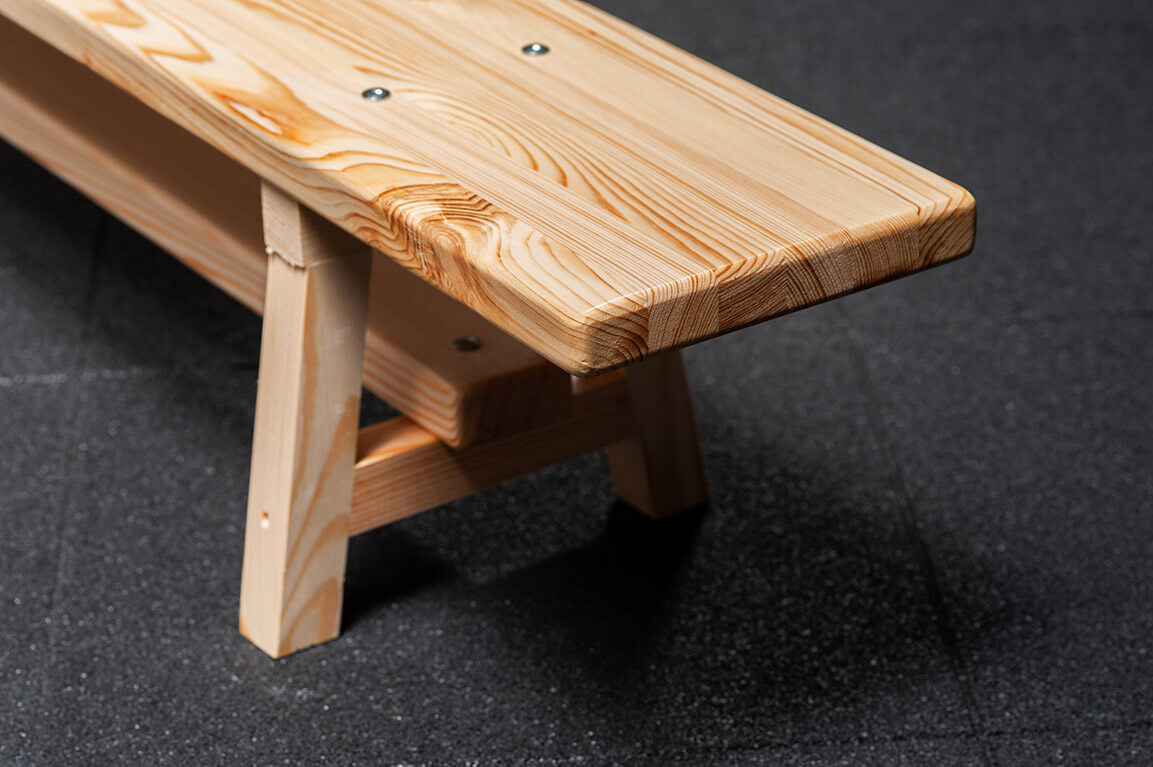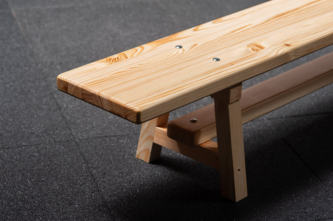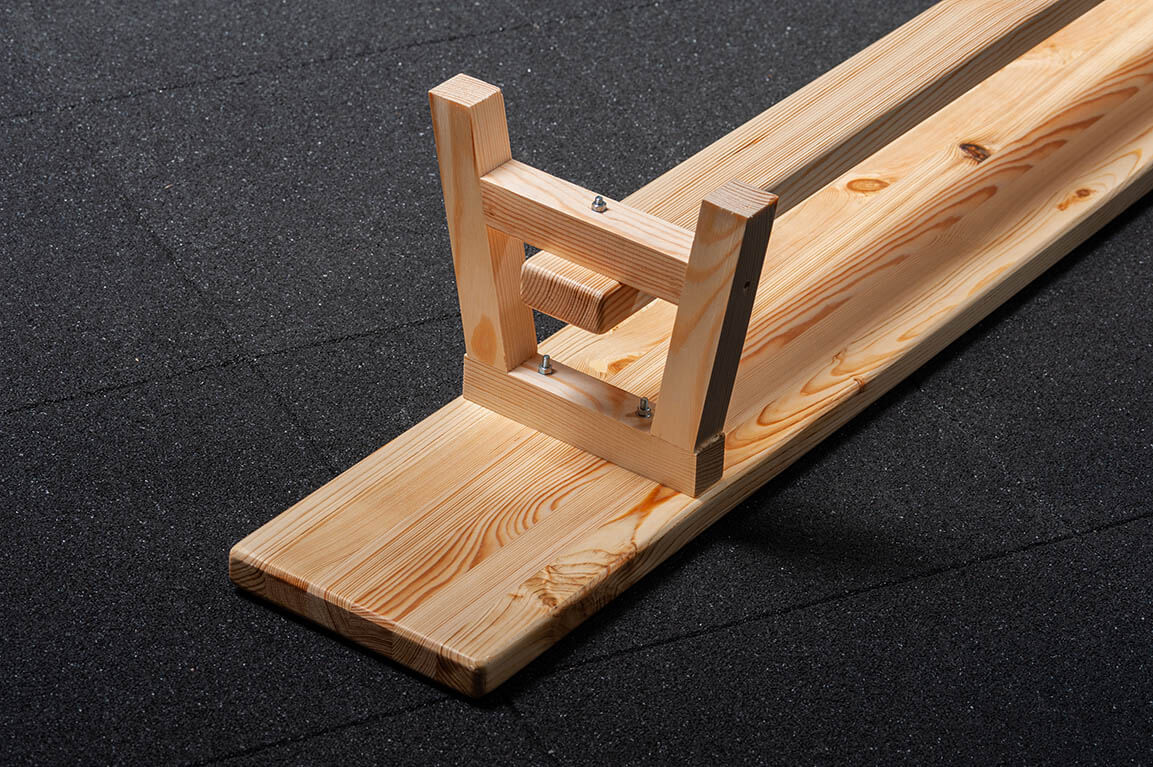 - Простая и надёжная конструкция гимнастической скамьи состоит из деревянной доски (сидушка) размером 35х240 мм, нескольких деревянных ножек и дополнительной связки (царга) в основании ножек размером 40х45 мм.