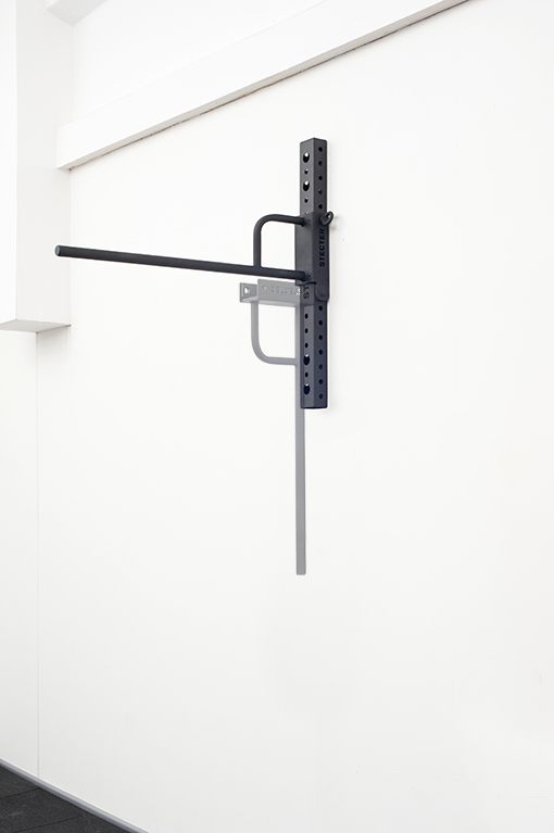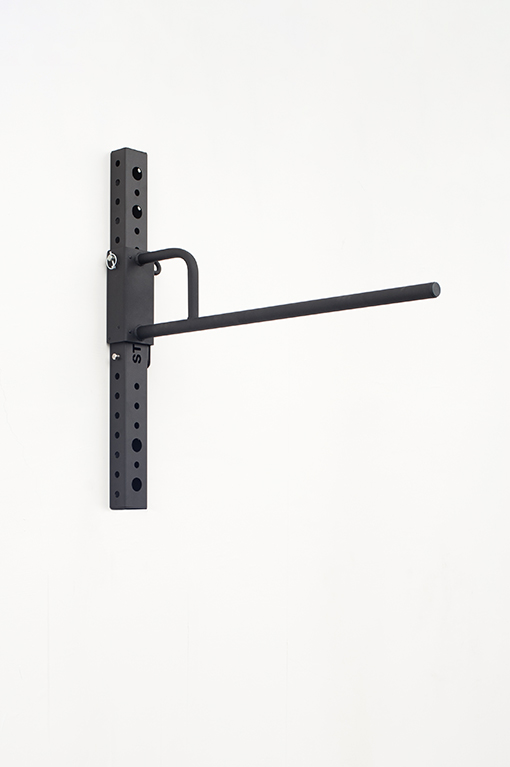 - Представленный набор состоит из двух элементов – настенный кронштейн с перфорацией и сам складной турник. Оба элемента окрашены матовой антискользящей порошковой краской черного цвета.