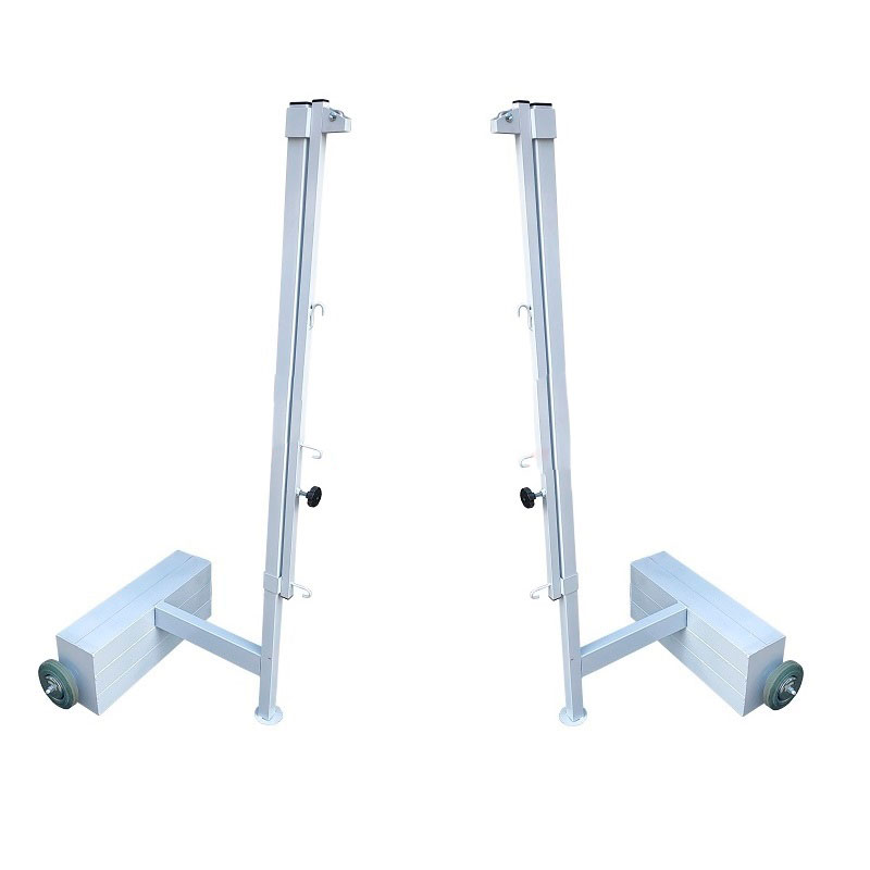 Стойки для бадминтона представляют собой комплект из двух сварных опорных вертикальных стоек, изготовленных из металлического профиля, с противовесами. Противовесы оснащены усиленными колёсиками для удобства перемещения стоек, и расположены на задней части противовесов.