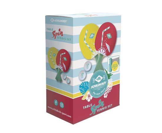 Набор для настольного тенниса DONIC SPIN, отличный выбор для активного отдыха. В комплект входит 2 ракетки, с красным и жёлтым покрытием. На покрытие нанесен принт белого цвета. Так же в набор входят 2 белых мячика с зелёным принтом. В наборе также есть складная сетка, держатели сетки- мятного цвета.