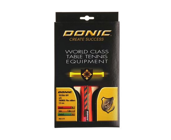 Ракетка Donic Testra OFF with Twingo Plus rubbers - одна из наиболее качественных ракеток для настольного тенниса. Она оптимально подойдет как для новичков, так и для более опытных спортсменов. Специальная накладка дает возможность посылать мяч точно в цель. Возможность того, что мяч не будет "слушаться" ракетку, практически нулевая. Особый материал, из которого сделана рукоять, позволит чувствовать себя еще более уверенно. Стоит заметить, что ладонь абсолютно не потеет.