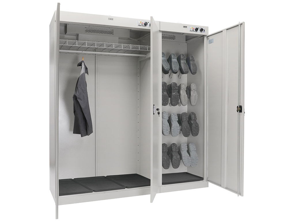 - шкаф состоит из двух независимых секций. Первая двухдверная для одежды, с перекладиной для вешалок и полкой. Вторая - для сушки обуви, оборудована патрубками для её развешиваниякаждый патрубок для обуви оснащён инерционным клапаном, перекрывающим подачу воздуха, если обувь не надета.