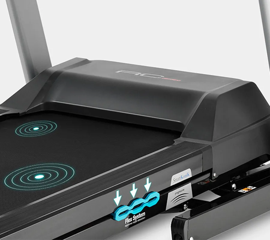 - Амортизация беговой дорожки представлена сочетанием двух элементов: FLEX SYSTEM и SMART KONIK. Данная система поглощает удары во время бега в 2 этапа. За счет такого подхода снижается эффект прыгучести на поверхности и сокращается вероятность получения травм.