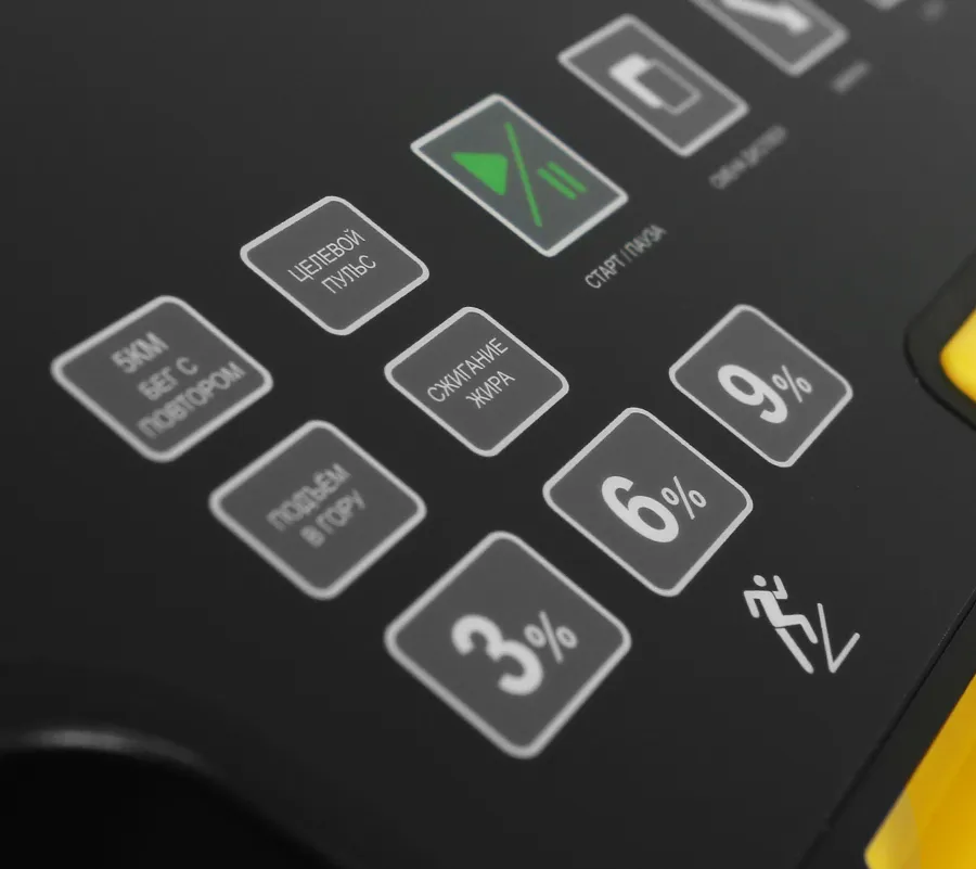 Тренировочный компьютер оборудован профессиональным LED-дисплеем с точечной матрицей. Основной экран дополняют 3 дополнительных буквенно-цифровых LED-дисплея. На мониторах отображаются следующие данные: тренировочный профиль, время, скорость, дистанция, калории, пульс, угол наклона, счет шагов. Все клавиши и дисплеи оснащены белой подсветкой, а надписи русифицированы. Эргономичные регуляторы скорости и угла наклона выполнены в виде джойстиков. В число самих программ входят 10 режимов, направленных на решение самого широкого спектра задач – от развития силы до снижения веса. Помимо предустановленных программ, можно воспользоваться самостоятельно регулируемым ручным режимом. Здесь также есть 3 целевые тренировки (время, дистанция, калории) и 3 пульсозависимые. Для точного определения пульса и просто комфортной тренировки в компьютер встроен высокоточный беспроводной приемник (рекомендуется использовать телеметрический ремень-передатчик).