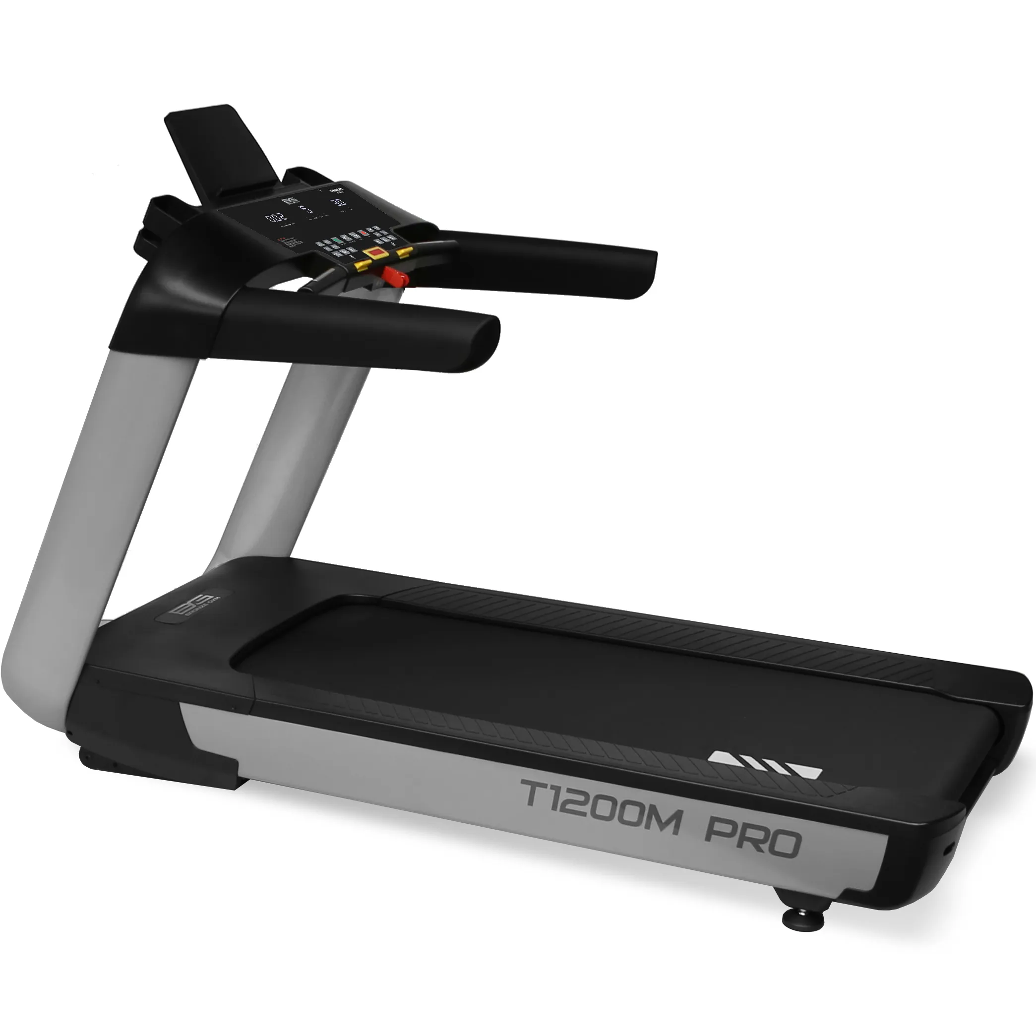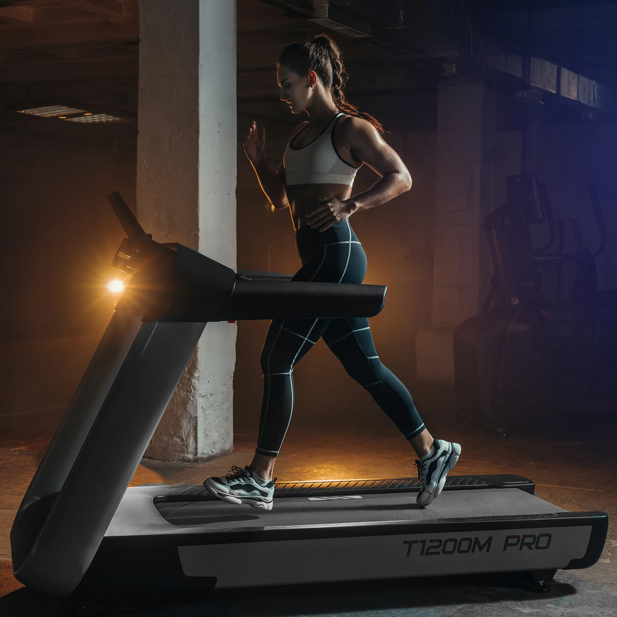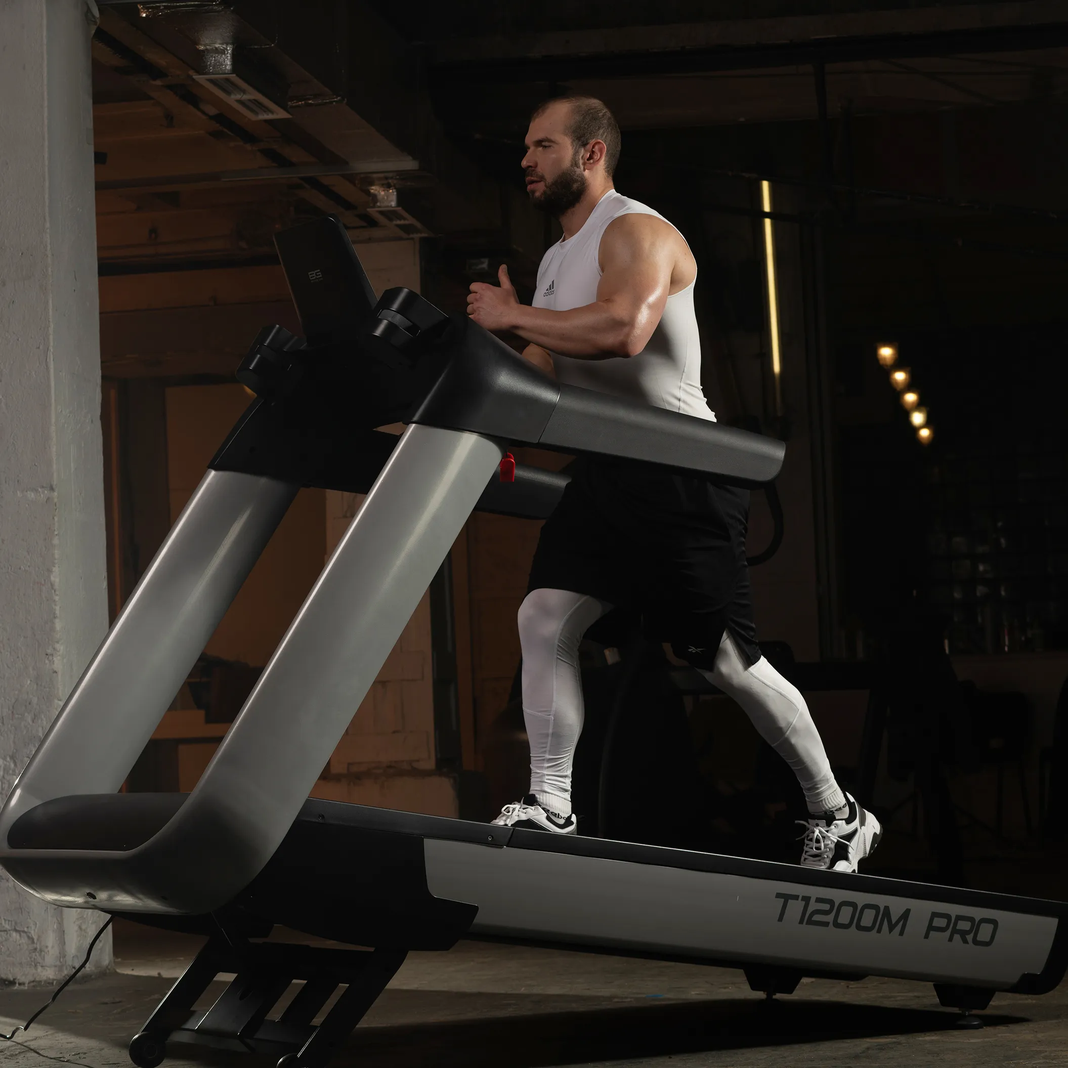 Помимо двигателя, у T1200M PRO масса других преимуществ. Электрически изменяемый угол наклона от -2 до 18%. Добавлена функция «Склон», которая означает, что у дорожки есть возможность установки отрицательного угла наклона бегового полотна до минус 2%. Усиленная двойная дека профессионального класса толщиной 25 мм. Длина беговой зоны составляет достойные 157 см при ширине 58 см. Полотно, толщина которого 2.4 мм, выполнено из специального полимера, который не только гарантирует длительную эксплуатацию, но и обеспечивает надежное сцепление. Мультиабсорбирующая динамическая система амортизации на основе системы комплексной защиты, включающей систему виброгашения. Передняя и центральная часть беговой зоны (то есть там, где идет основная ударная нагрузка на ноги) настроены на более мягкую амортизацию. Задняя часть, в зоне отрыва стопы, - на более жесткую.