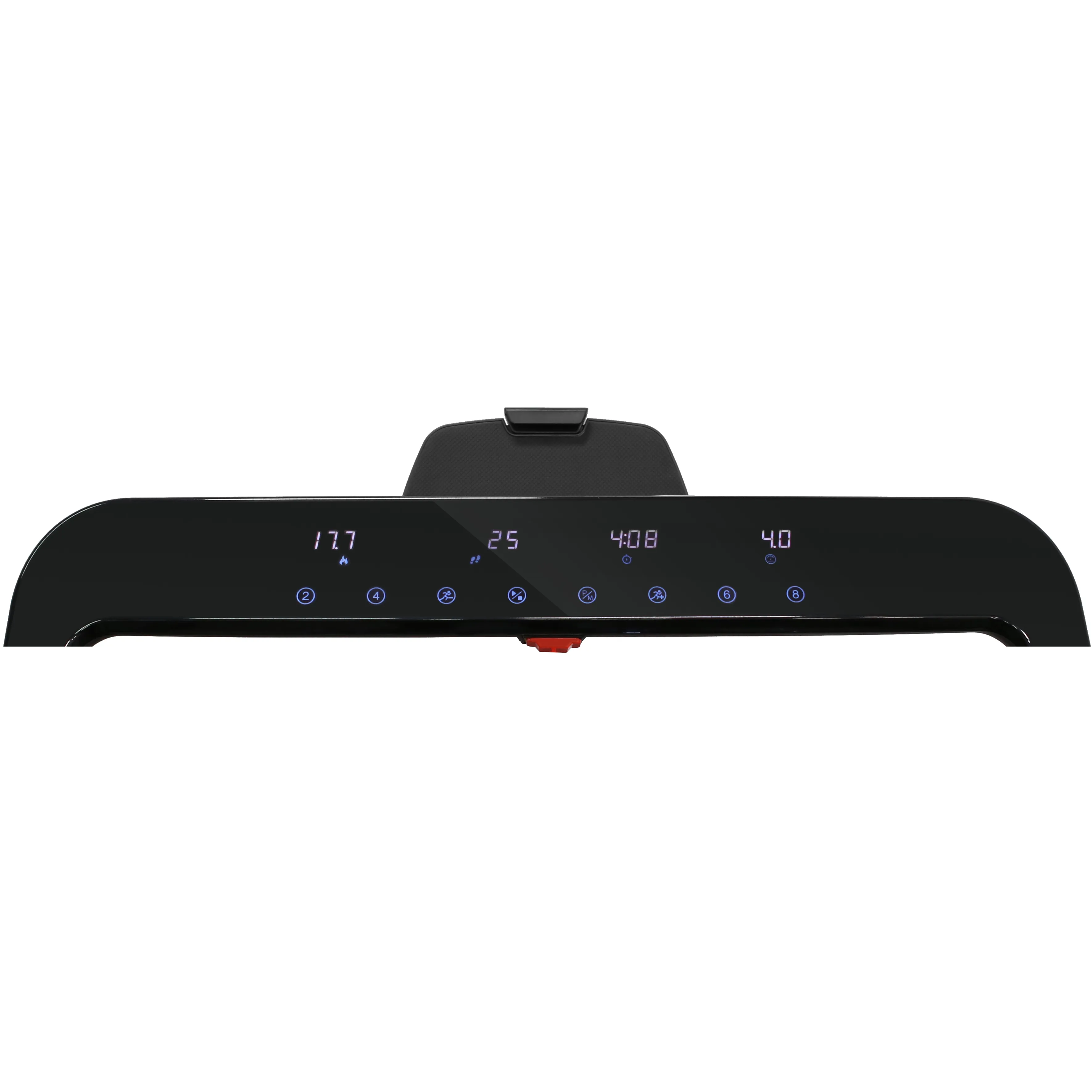 Модель Carbon Fitness T708 SLIM имеет весь необходимый набор для проведения эффективных тренировок. Информативная консоль с 4-мя яркими буквенно-цифровыми LCD-дисплеями, отображает следующие показатели: расстояние, калории, шагометр, время, скорость. Все показатели изменяются при помощи сенсорных кнопок. В памяти консоли содержится 19 программ, 15 из которых помогут пользователям начать тренировочный процесс вне зависимости от их уровня подготовки. Сделать упор на конкретный показатель можно при помощи режима целевых тренировок (дистанция, калории, время). Помимо установленных программ, можно воспользоваться регулируемым ручным режимом. Подставка для гаджетов имеет специальный регулятор, необходимый для фиксации устройств различных размеров.