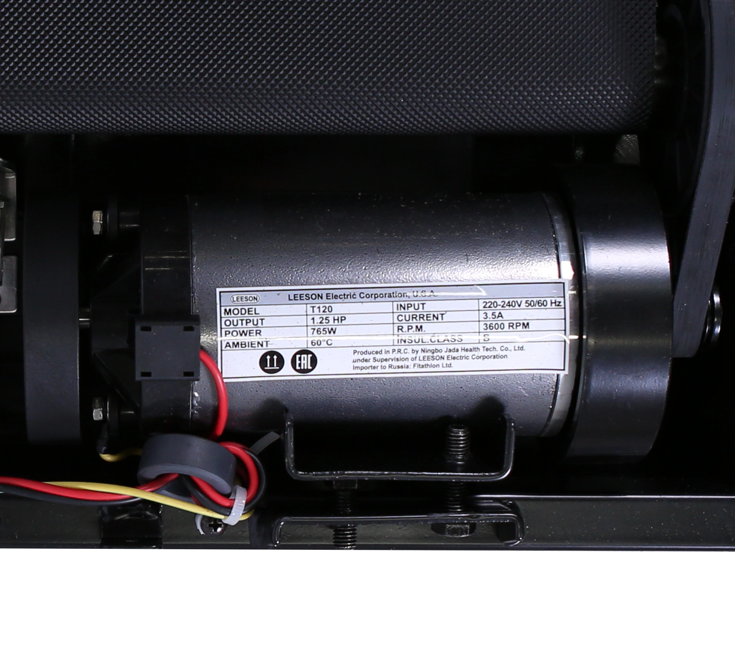- Начинкой T120 является мотор от американского производителя LEESON. Мощность двигателя всего 1.25 л.с., но тем не менее, это позволяет разгонять беговое полотно до 10 км/ч, что дает возможность не только ходить, но и заниматься бегом.