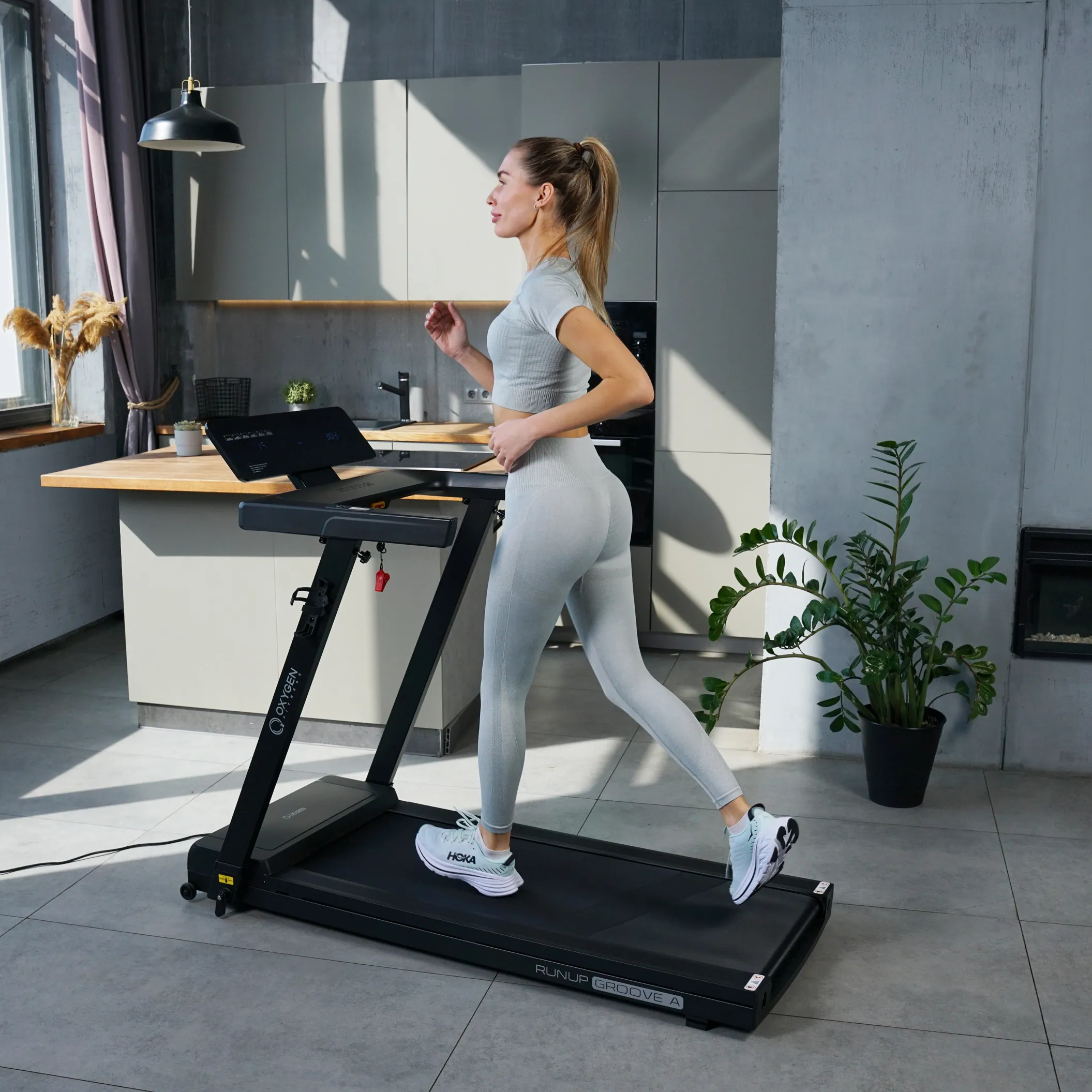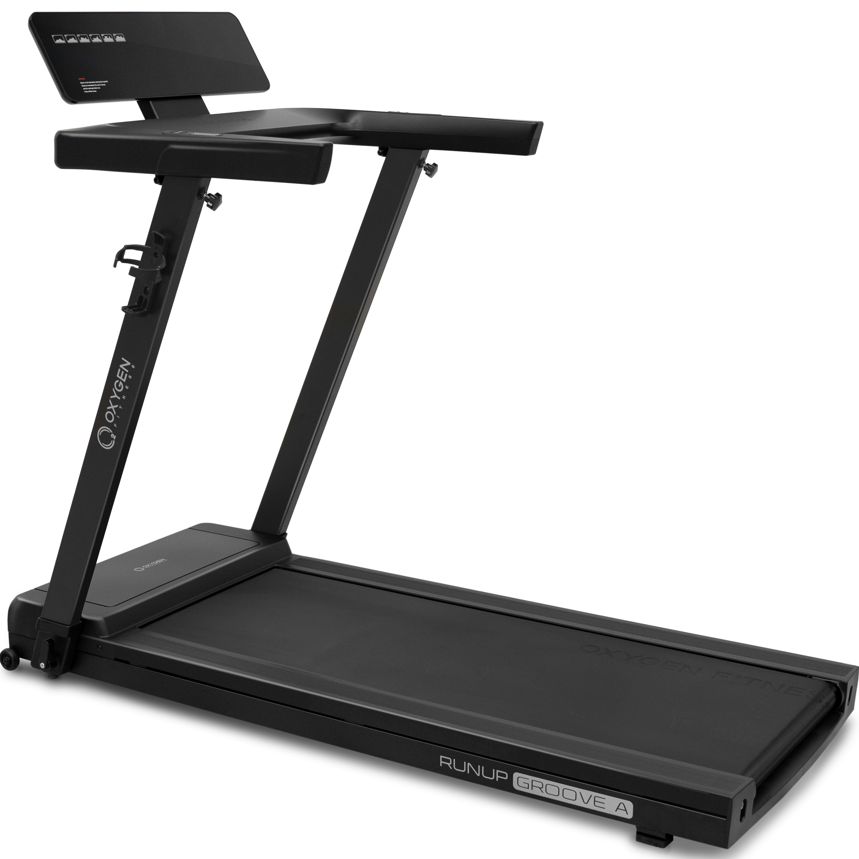 - В OXYGEN FITNESS RUNUP GROOVE A установлен двигатель от японского производителя Fuji Electric, его мощность составляет 2.5 л.с. в режиме постоянной эксплуатации. При пиковых нагрузках – 4.4 л.с. Такой показатель мощности позволяет достичь разгона скорости до 16 км/ч.