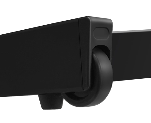 - Перемещение дорожки происходит за счет 2-х транспортировочных роликов. Выровнять положение тренажера относительно поверхности можно за счет компенсаторов неровностей пола.