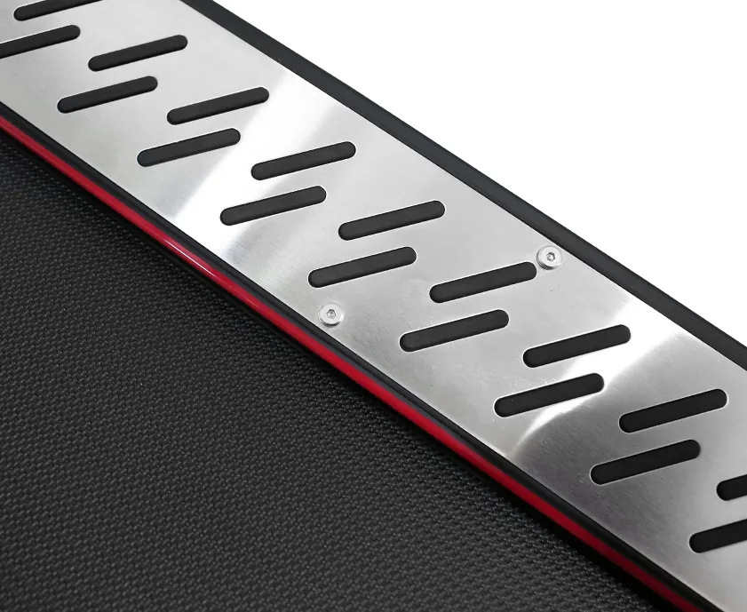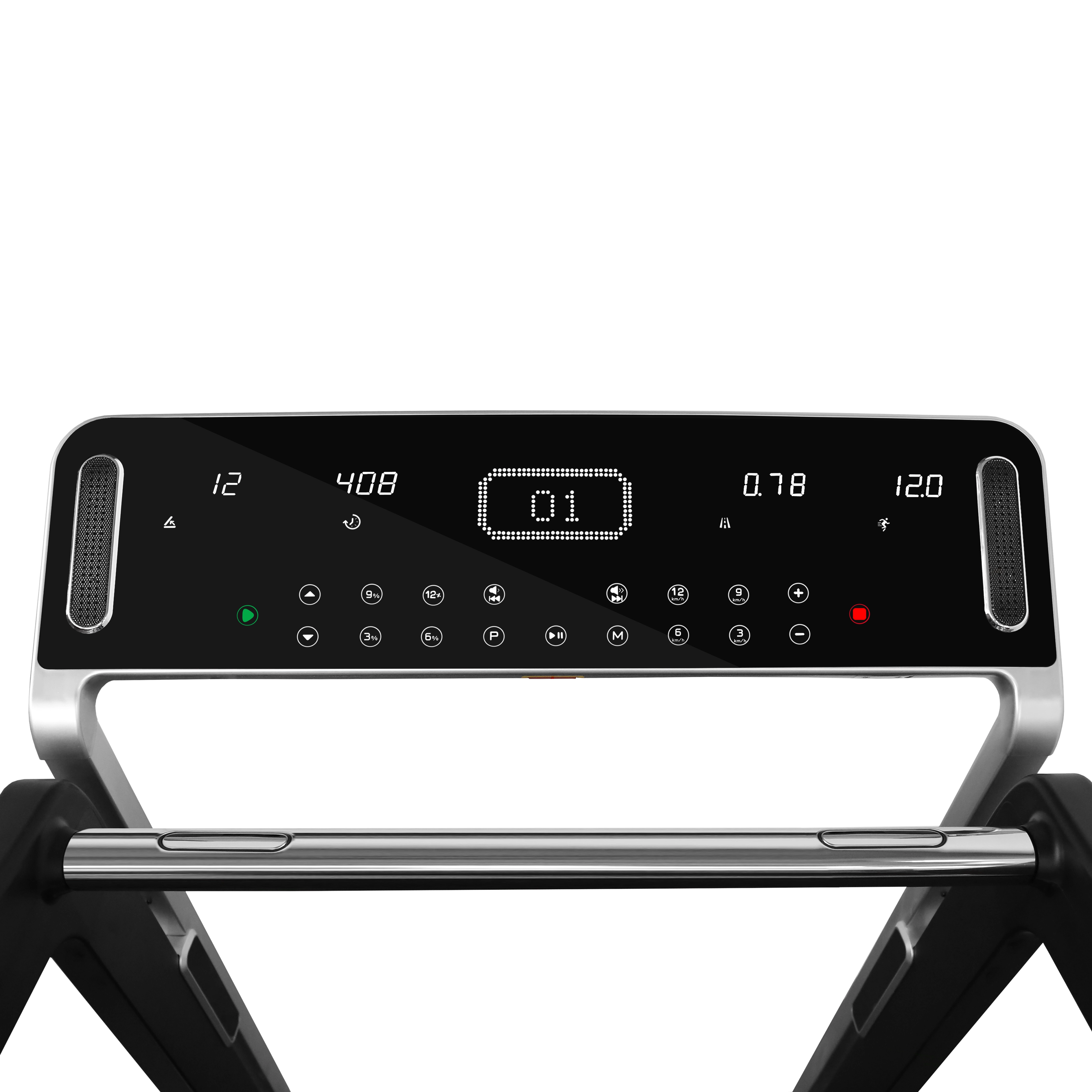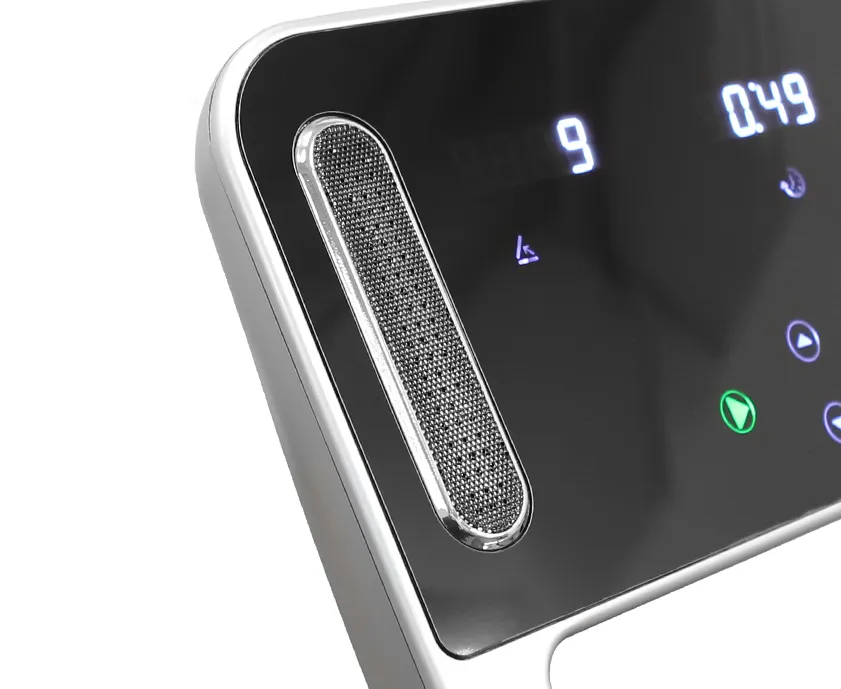 - Особое внимание на GO T66 уделено консоли. В отличие от большинства других беговых дорожек, здесь используется небольшая тонкая прямоугольная консоль, покрытая черным глянцем. Тренировочный компьютер представлен профессиональным LED дисплеем и 4 дополнительными буквенно-цифровыми LCD экранами. Абсолютно все клавиши управления сенсорные и подсвечены внутренними светодиодами. Когда дорожка выключена, ее консоль представляет собой стильный черный экран.