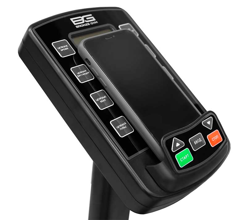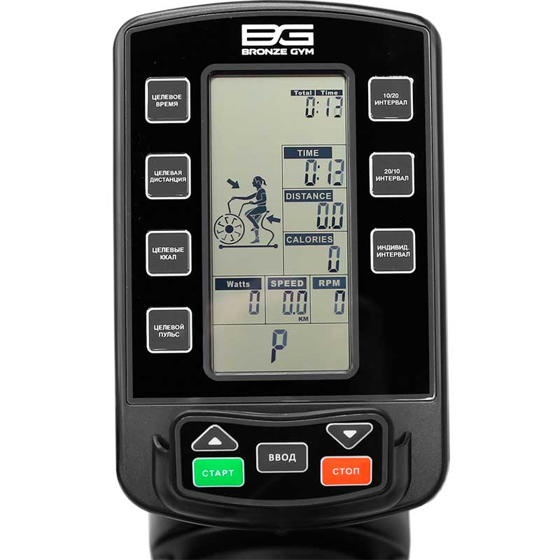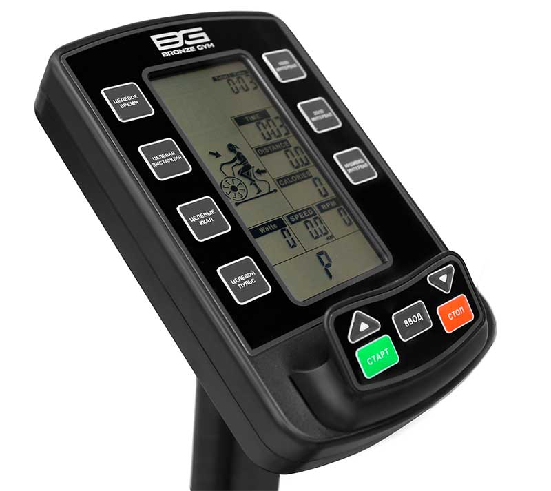 - Тренировочный компьютер представлен дисплеем профессионального уровня. На экране отображаются следующие данные: время, скорость, дистанция, расход калорий, пульс, темп, ватт, интервал.