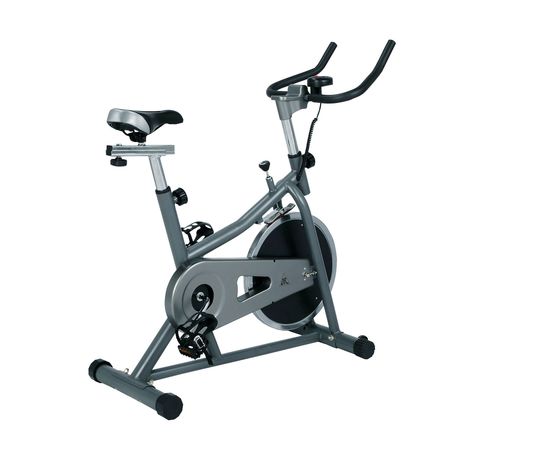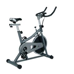 Вертикальный механический спин-байк с ременным типом привода и колодочной системой нагружения. Изменение нагрузки с помощью рукоятки на корпусе тренажера.