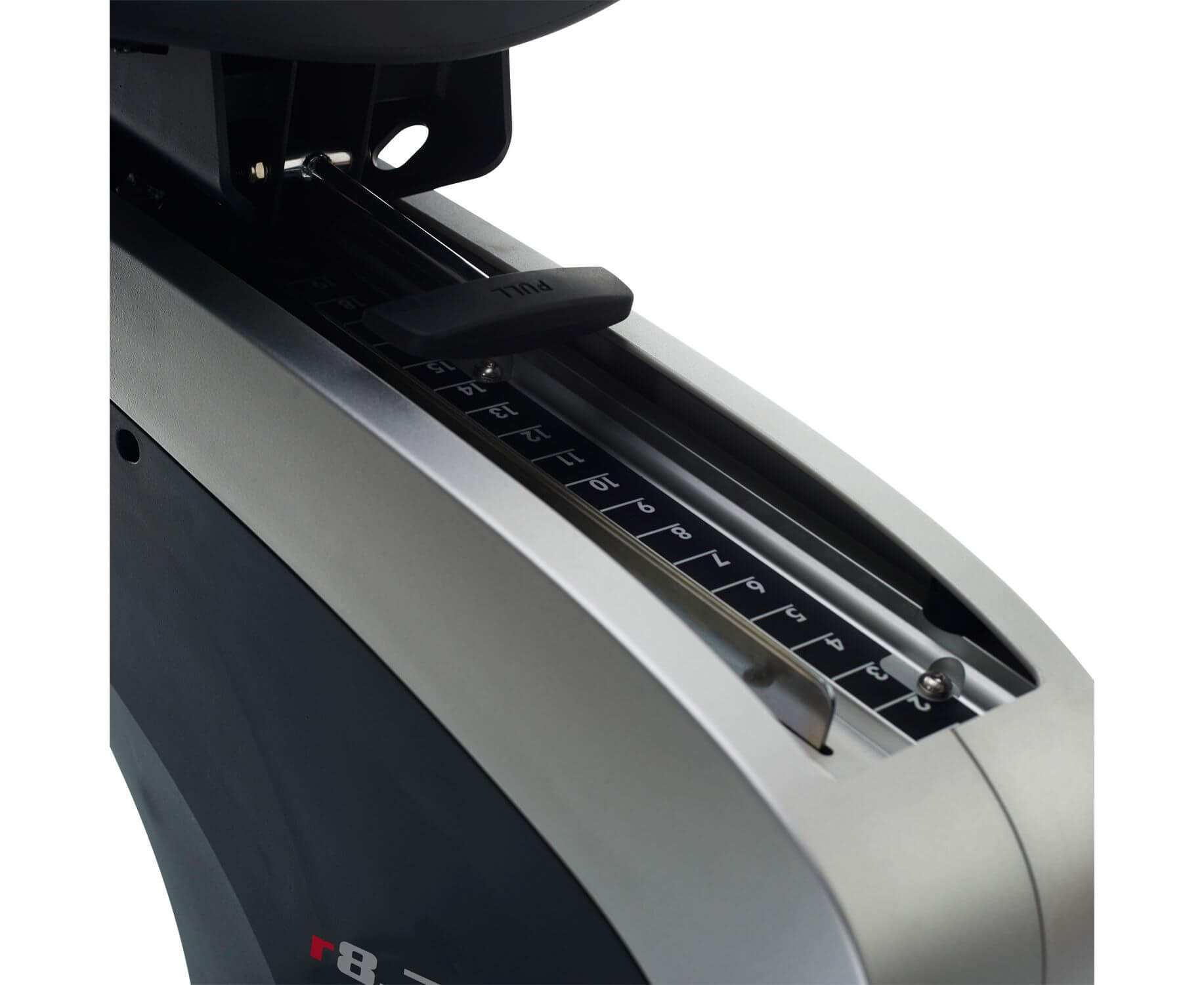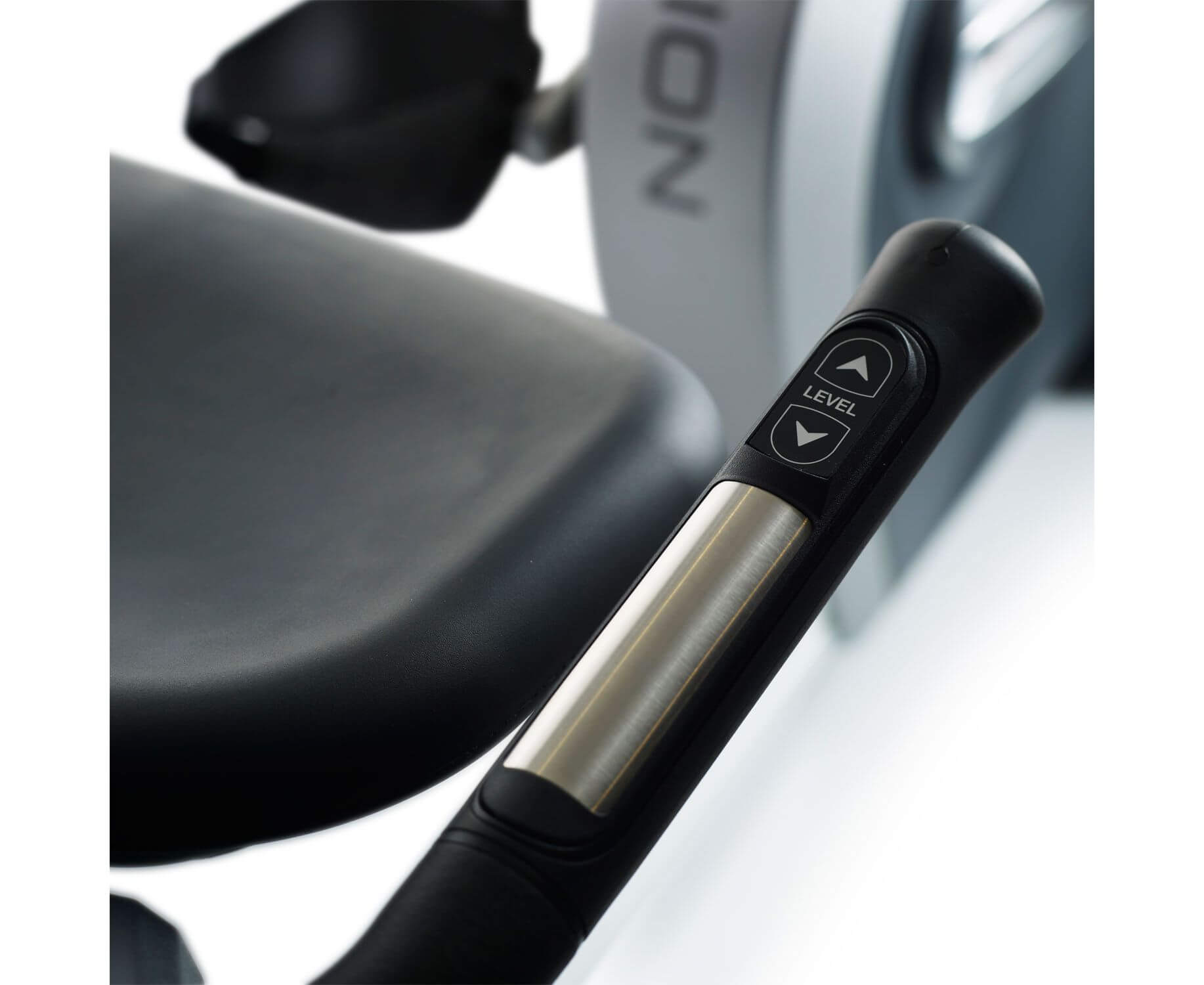 - Велотренажёр оборудован сиденьем, положение которого можно подстроить под свои индивидуальные параметры при помощи регулировочного рычага. Отодвиньте рычаг в сторону, после чего установите сиденье в удобное для вас положение и верните регулировочный рычаг на место.