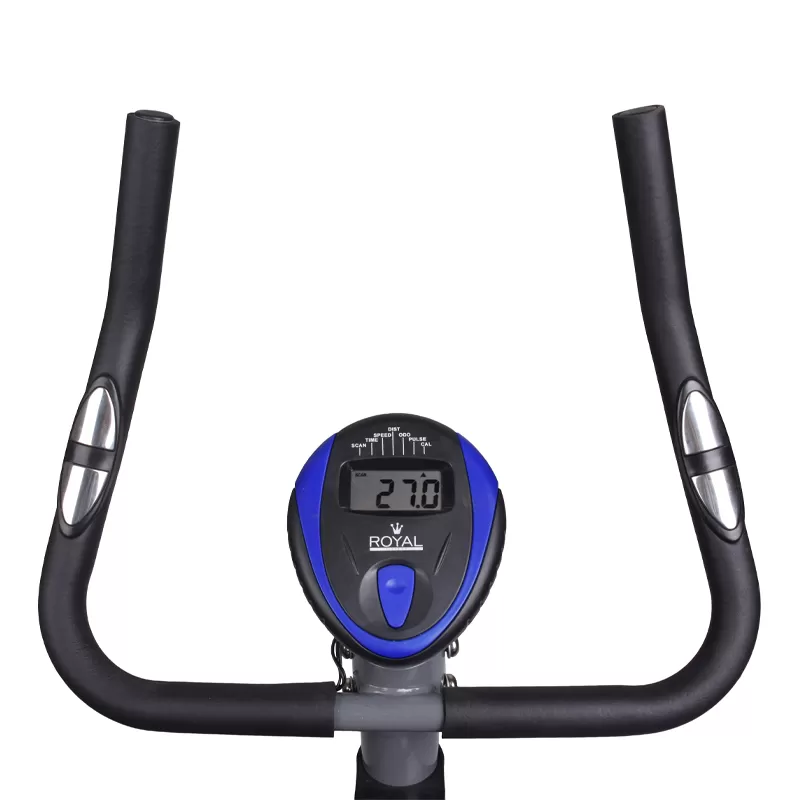 - На руле расположены 2 датчика пульса с отображением показаний на дисплее консоли. На монохромном дисплее отображаются основные параметры тренировки: длительность занятий, дистанция, текущая скорость, затраченные калории, пульс.