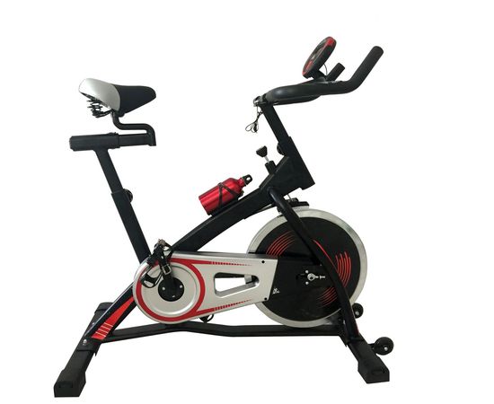 Вертикальный механический спин-байк с ременным типом привода и колодочной системой нагружения. Изменение нагрузки с помощью рукоятки на корпусе тренажера.