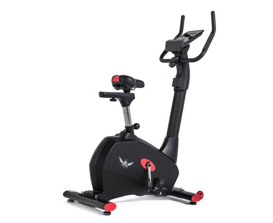 Тренажёр выполнен в стильном дизайне: бархатный чёрный цвет «разбавляют» ярко-красные вставки. Эта модель отмечена и логотипом производителя: крылатым значком DFC Cardio на боковой панели велотренажёра.