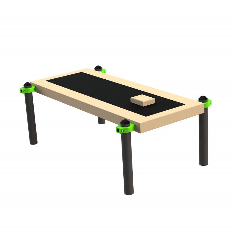 Столбы выполнены из трубы диаметром 89х3 мм, перекладина из трубы диаметром 34х3,2 мм и покрыты полимерной краской, что обеспечивает надёжную защиту изделия. Основание скамьи