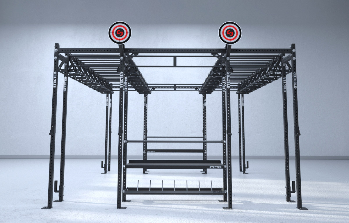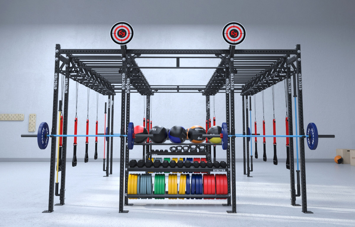 - Для функционального тренинга (кроссфита) предусмотрены 4 рабочих места, оборудованных J-крюками для штанги, держателями для грифа штанги и мишенями для медболов.