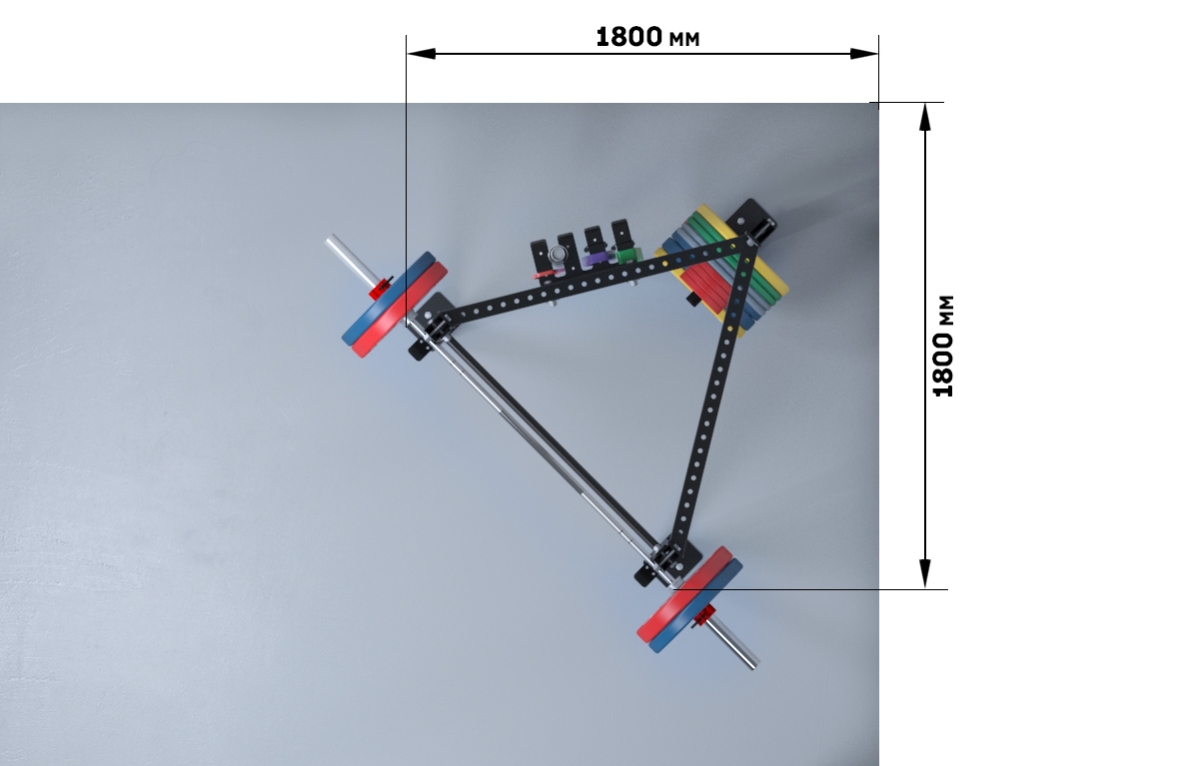 - Три вертикальных стойки высотой 2810 мм скреплены в верхней части треугольной балкой и одинарной перекладиной для подтягиваний.