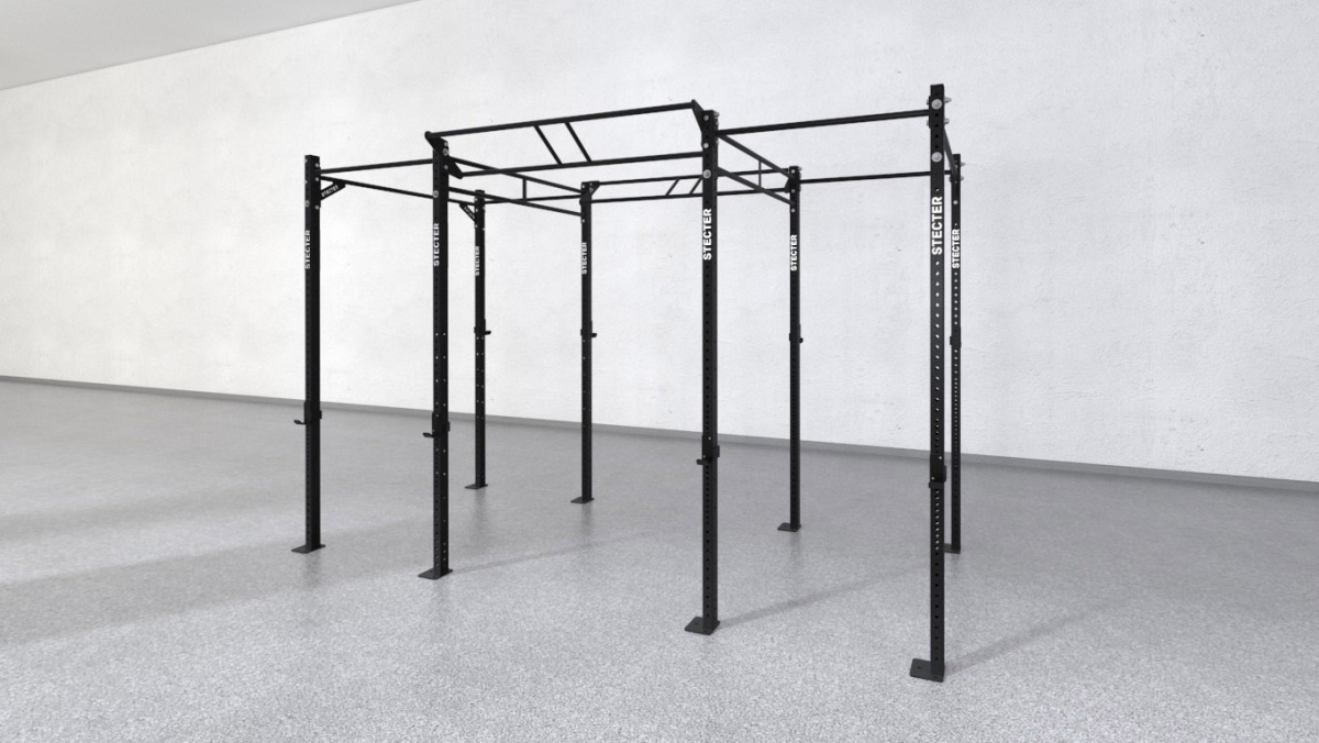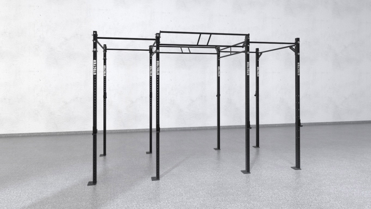 - Трехсекционная функциональная рама комплектуется восемью опорными стойками высотой 2810 мм. Они соединены одинарными и двойными перекладинами по 1100 мм и 1800 мм, а так же J-крюками для штанги.