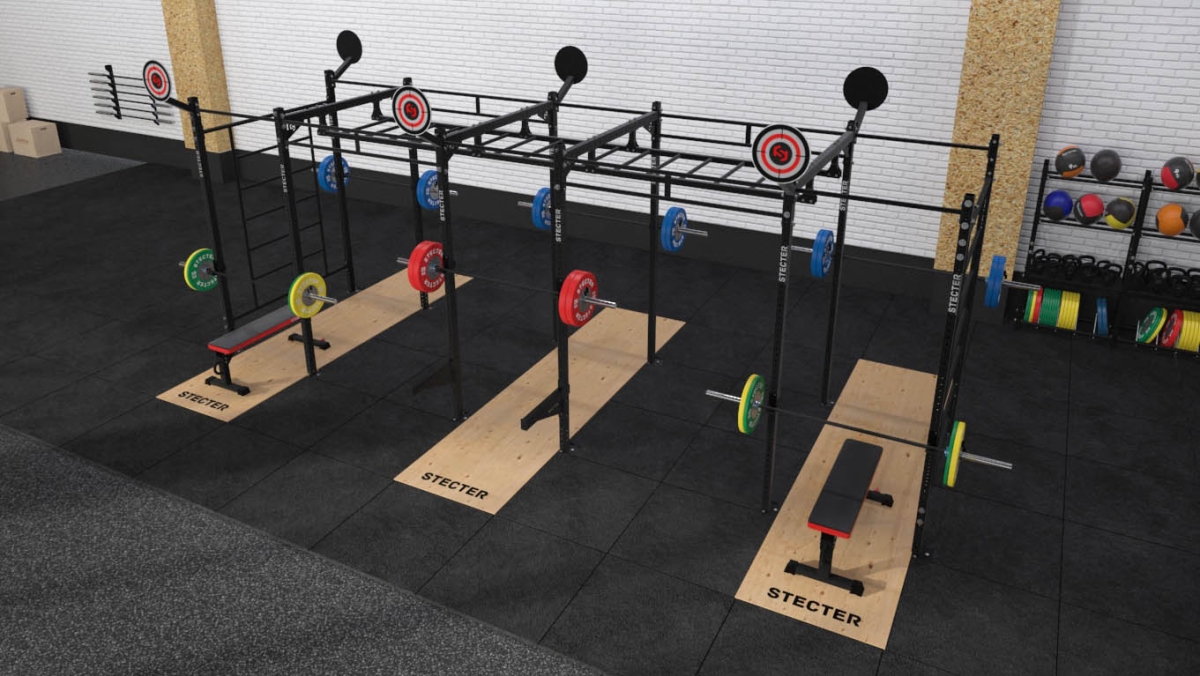 - Шесть пар J-крюков позволяют полноценно работать с штангой одновременно 6 атлетам.
