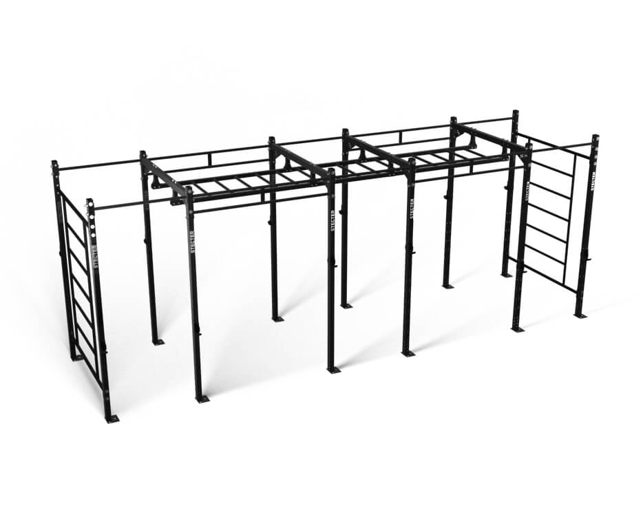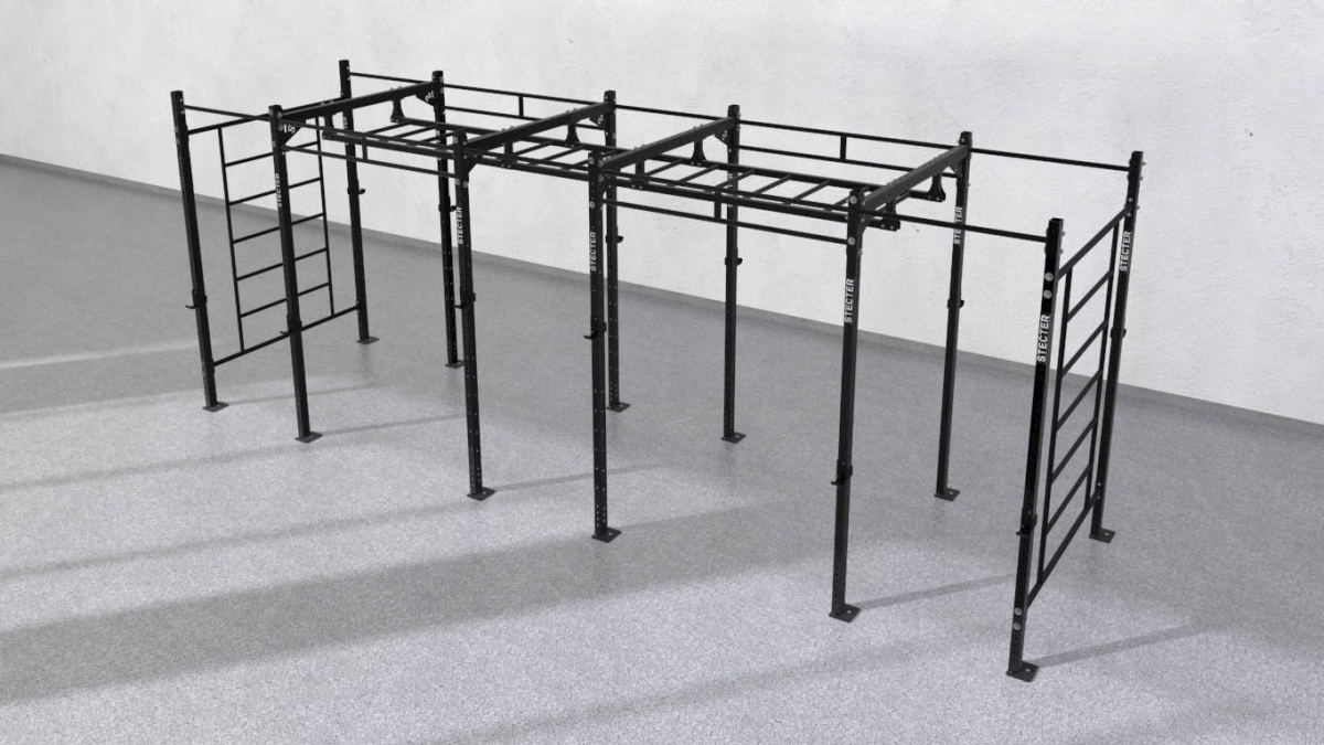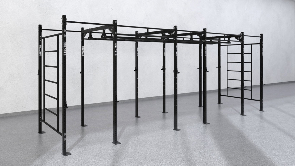 - Функциональная рама для Кроссфит 6900х1800 – сборная конструкция, состоящая из десяти опорных стоек по 2810 мм в высоту, которые скреплены одинарными и двойными перекладинами длиной 1100 мм и 1800 мм. Так же в раме установлен рукоход и шведские стенки.