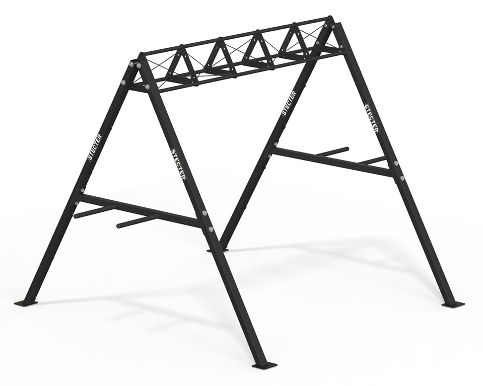 - Стальные опоры соединены между собой брусьями, что, во-первых, расширяет функциональность, а во-вторых, повышает ее прочность.