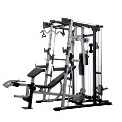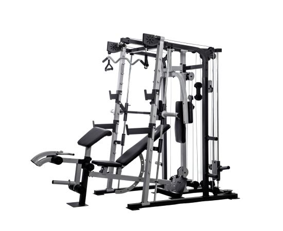 Тренажер предназначен для выполнения различных силовых упражнений: Машина Смита, тяга сверху / снизу, баттерфляй, парта для бицепса, сгибание / разгибание, жим лежа на скамье дополнительной штанги (опция).